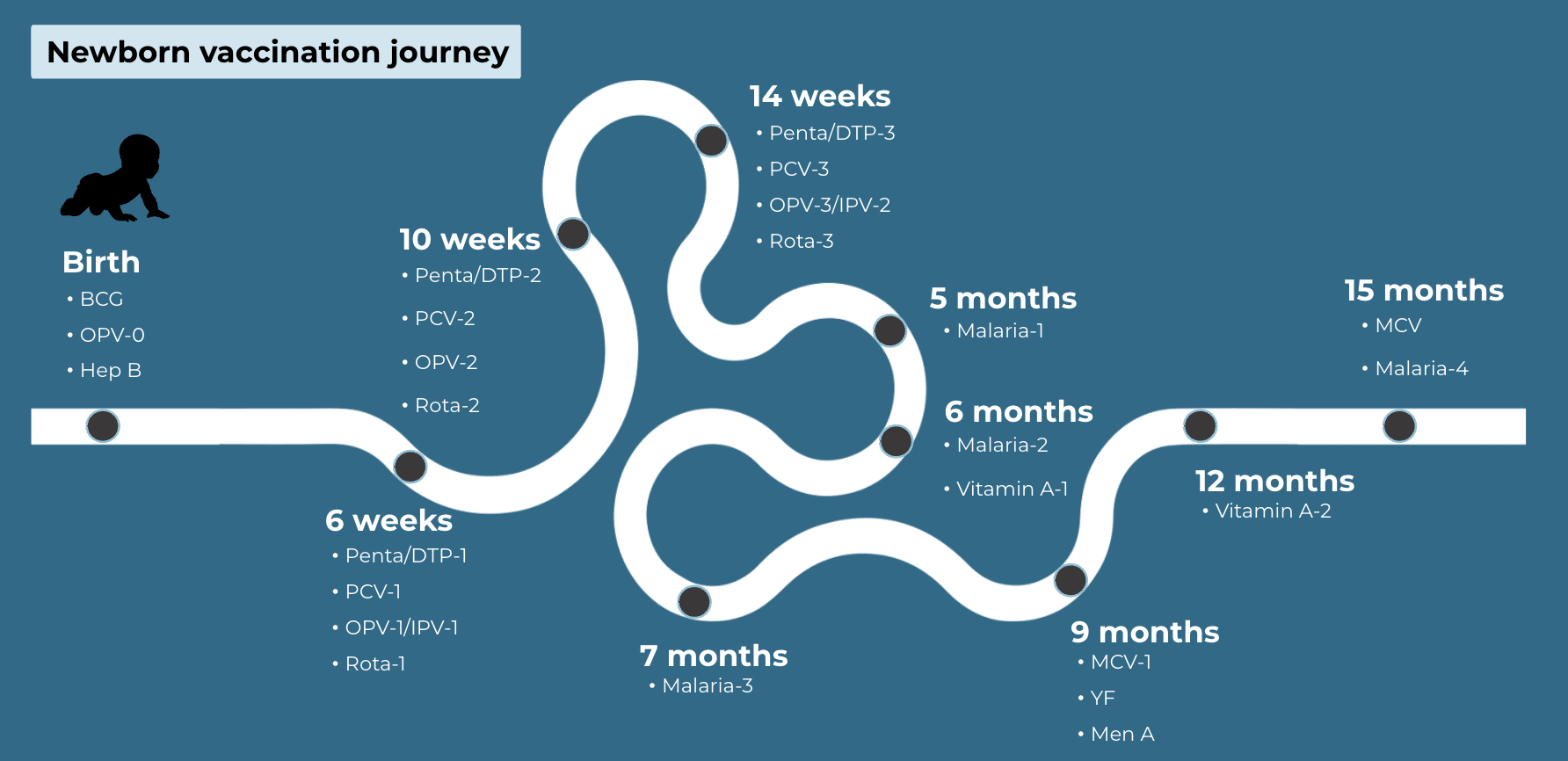 One persistent barrier to vaccination demand is simple “lack of knowledge or information”. There are many Nigerian states where this type of barrier exists for ~50% of caregivers who miss a vaccination appointment.[2] This includes caregivers who mistakenly believe their child is already fully immunized, are unaware that multiple visits are required, or simply forget to go. Nigeria’s routine immunization schedule requires at least six separate visits at different intervals during a child’s first fifteen months of life — a sequence that can be difficult for caregivers to remember. This schedule will become ever more complicated when considering the imminent introduction of the R21 malaria vaccine, which requires doses at 5, 6, 7, and 15 months (adding three visits on top of the existing schedule). In a system where health workers are incredibly stretched and records are paper-based, many caregivers and their children fall through the cracks once they leave the facility.