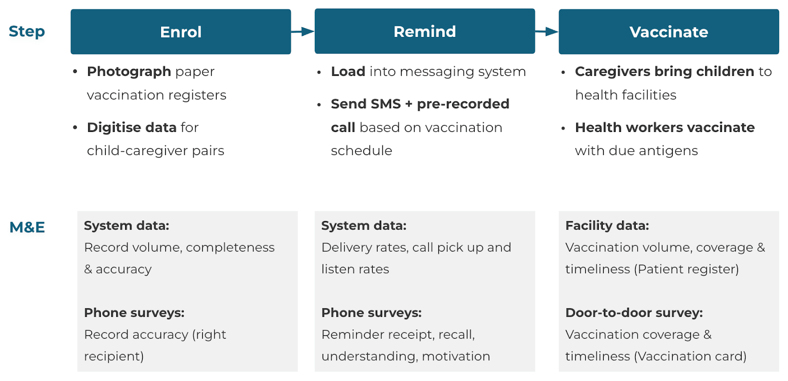 Given existing RCTs and meta-analyses showing SMS reminders generally work to increase vaccination outcomes, the part of our theory of change that we were most uncertain about was our ability to enrol children into the program cost-effectively – particularly in the absence of an already existing electronic database – and then automatically send them reminders.