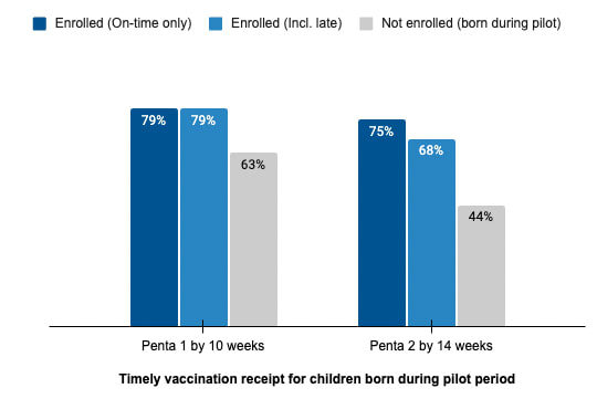 Children enrolled in the program were significantly more likely to receive vaccines on time. For Penta-1, 79% of enrolled children were vaccinated by 10 weeks, compared to 67% of non-enrolled children — an absolute difference of 12 percentage points. This means for every 8 children enrolled, 1 additional child received Penta-1 on time (NNT = 8). For Penta-2, 75% of enrolled children were vaccinated by 14 weeks, versus 51% of non-enrolled children — a 24 percentage point difference (NNT = 4).