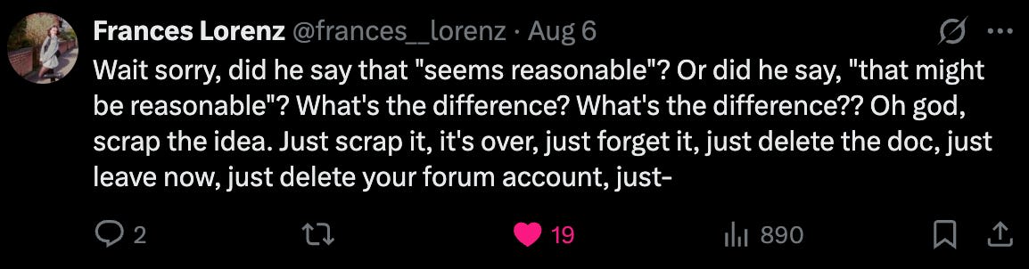 When you “work in public” you both get more feedback so that you can grow, and you get to show people that you’re pretty good at what you do. If you think you’re not good enough to do that yet, feedback is still the answer—ask for Google Docs comments from trusted mentors or peers, post a mini version of your argument/project on Twitter or brave the wilds of LessWrong, do a part-time fellowship or course, anything to get eyes on your project. Fear of rejection is probably holding back most people’s learning, myself included.