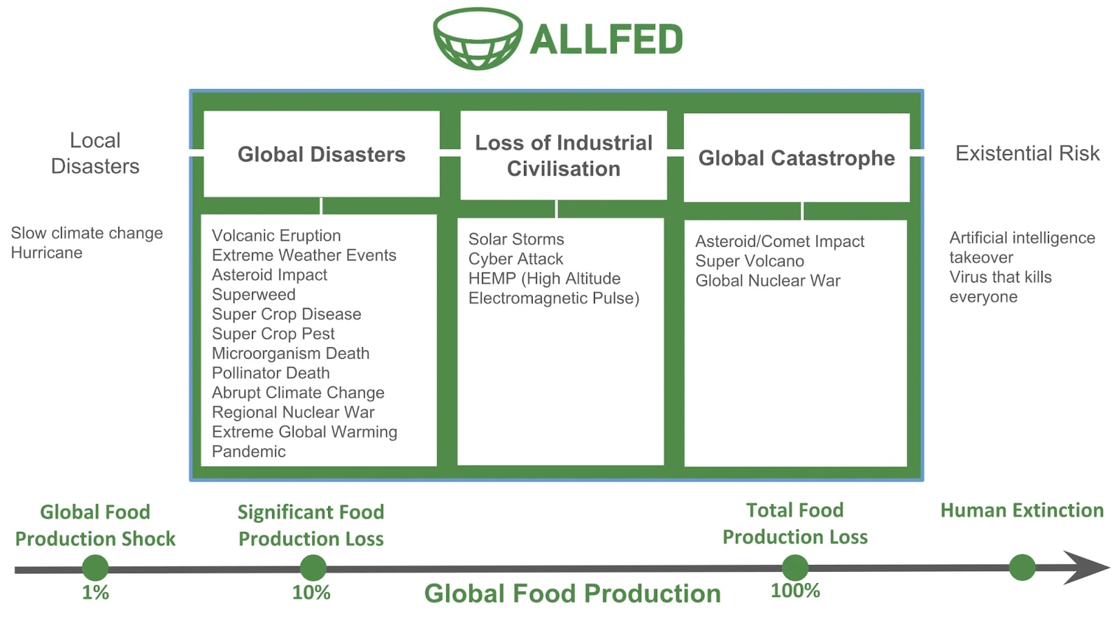 The Alliance to Feed the Earth in Disasters (ALLFED) is a nonprofit organization dedicated to increasing the probability that if a global disaster or catastrophe occurs, then survivors will be able to consume sufficient nutrients to maintain civilization. We focus primarily on developing alternative food solutions for various catastrophes, particularly those that could block the sun’s light, such as an asteroid impact, a supervolcanic eruption, or nuclear winter. We also focus on scenarios involving the loss of electricity, infrastructure, or industry, which could be caused by an extreme solar storm, a narrow artificial intelligence (AI) cyberattack, or an extreme pandemic. We are most concerned with the events listed in the graphic below, as well as the cascade of threats that any of these events could trigger (e.g., climate change leading to a multiple breadbasket failure, leading to a refugee crisis, which then enables an even more devastating pandemic than COVID-19, and so on). While each of these catastrophes might individually have a low probability of occurrence, the odds that some type of global disaster or catastrophe will occur is much higher, and so we focus on alternative foods that can help ensure survival through any of these events.