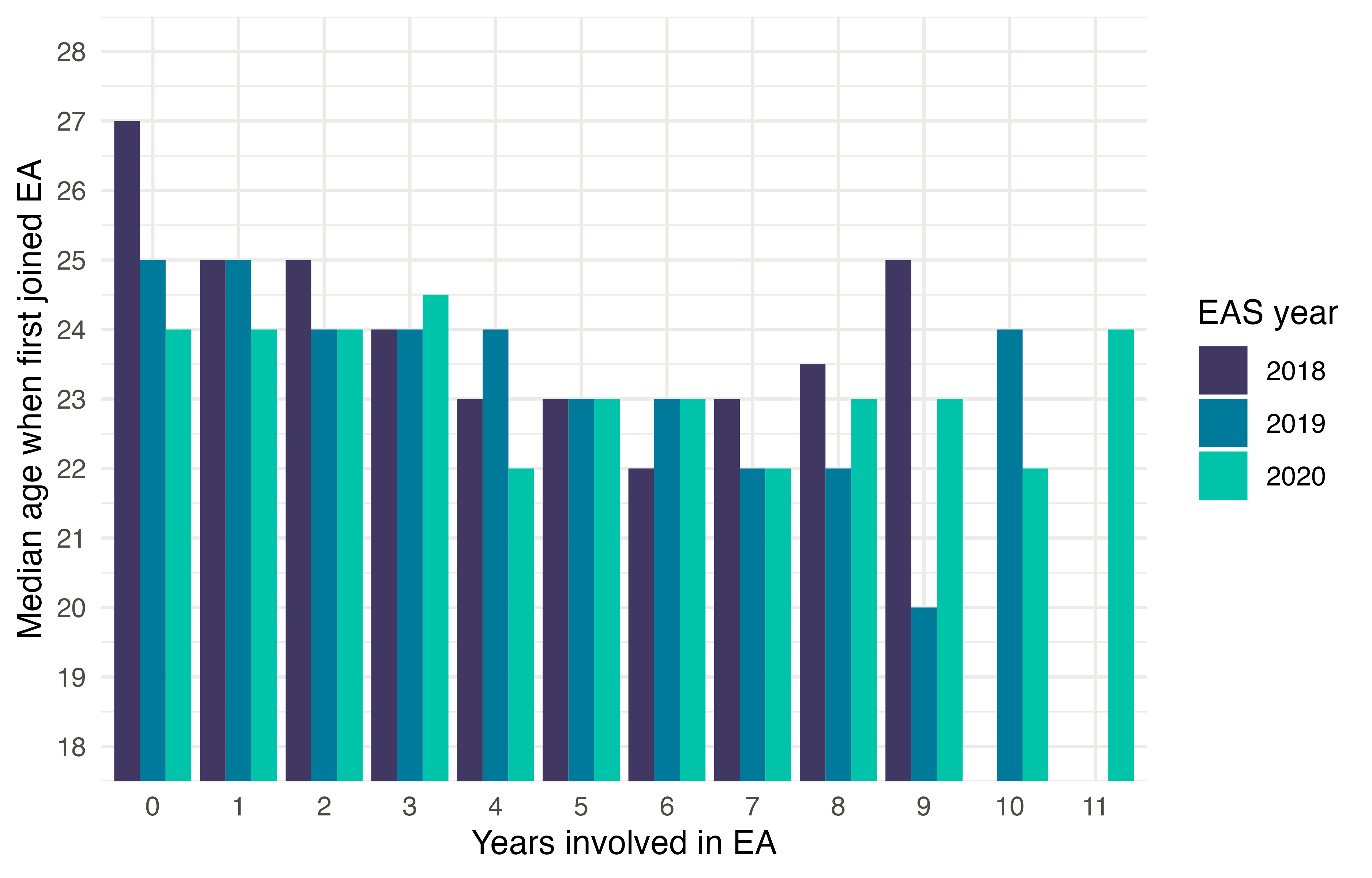 If we look at the median age at which people first got involved in EA over the last few years (split by how many years they’ve been involved in EA to account for differential attrition), we can see that the median age of people first getting involved in EA in 2018, 2019 and 2020 declined (from 27 to 25 and then to 24).