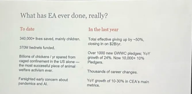 All in all, I think effective altruists are often way too pusillanimous. We should be more willing to say: effective altruism is very good both epistemically and morally. Being an effective altruist is neither cringe nor embarrassing. Despite being relatively small, EAs have had an unprecedented moral impact. Hundreds of thousands of extra people would be dead if the movement had never existed. If you give away some of your income to good charities or take a high-impact career, you should be proud. The criticisms of effective altruism are by and large lame.