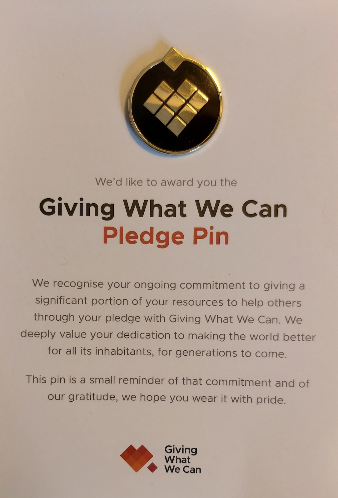 Executive summary: Receiving a Giving What We Can pledge pin represents a year of donating 10% of income to effective charities, reflecting the author’s values and efforts to do good in the world.