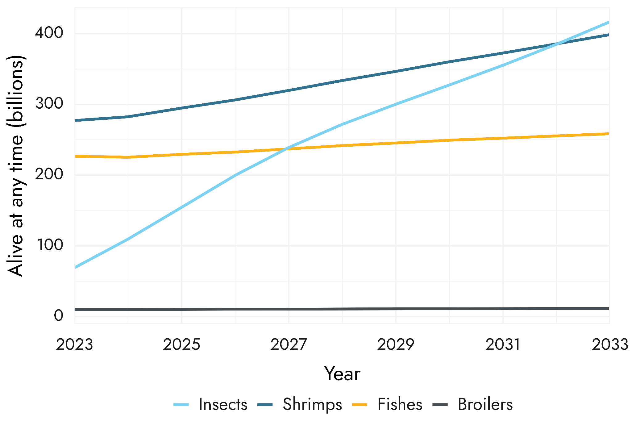 The last barrier to animal-welfare social change that I want to address is the developing world. As we all know but don’t particularly care to think about, meat consumption in the developing world is only going to rise. According to a 2025 Rethink Priorities report, this could mean as much as a doubling of the number of animals farmed at any time between 2023 and 2033, if invertebrates are included.