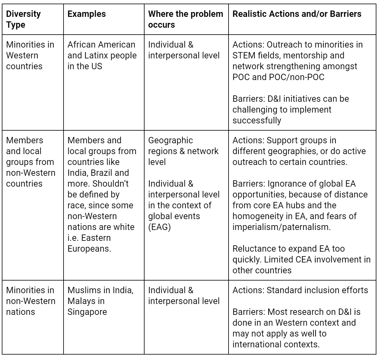 There appear to be three main types of ethnic diversity (including ethnicity, race, religion and local community) which would be addressed in different ways. It might make sense to separate conversations around these efforts, as the solutions required for these different types of diversity could differ .