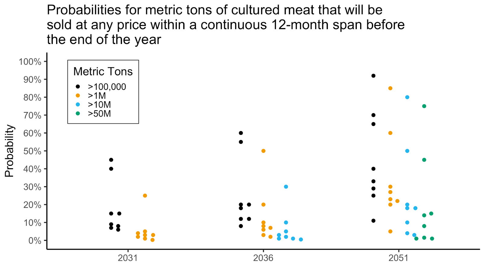 The probability for >100,000 metric tons of cultured meat sold in a 12-month period before the end of 2031 was 15%, but the probability for >100,000 metric tons sold for <$10/kg wholesale on average in a 12-month period before the end of 2031 was 6%.