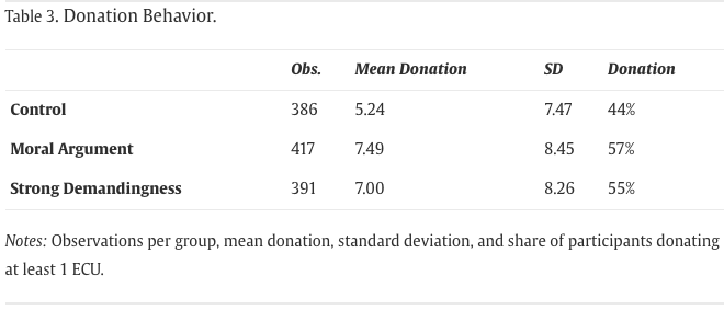 We compared a control treatment to a moral argument treatment, and we also varied the level of moral demandingness to donate after they read the moral argument. We found that the moral argument increased the frequency and amount of donations. However, increasing the levels of moral demandingness did not translate into higher or lower giving.