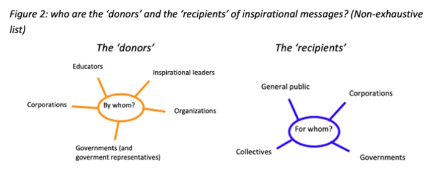 Before we dive into this argument, we must clarify three things: where can inspiration be found; by whom it can be transmitted; and for whom? Figure 1 presents a non-exhaustive list of mediums through which inspirational messages can be transmitted, and Figure 2 shows who can transmit inspirational messages, and to whom. For the sake of clarity, we will consider inspirational messages with the broad purpose of generating better animal protection, consideration and care, and we will not scrutinize animal causes/issues themselves in depth.