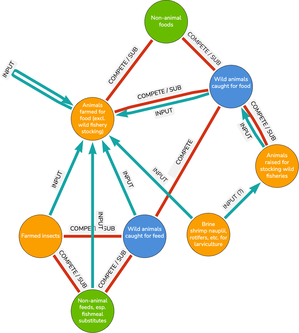 Various fishing-related interventions and aquafeed-related interventions (e.g. supporting fishmeal substitutes) can have important effects on animal agriculture, and there are potentially important tradeoffs to consider. I graph the relationships between various foods and feeds, and provide background on them. Focusing on the impacts on farmed animals, the most important takeaways are probably the following: