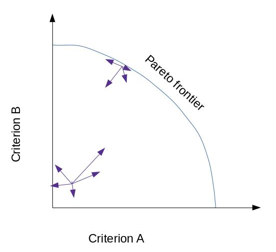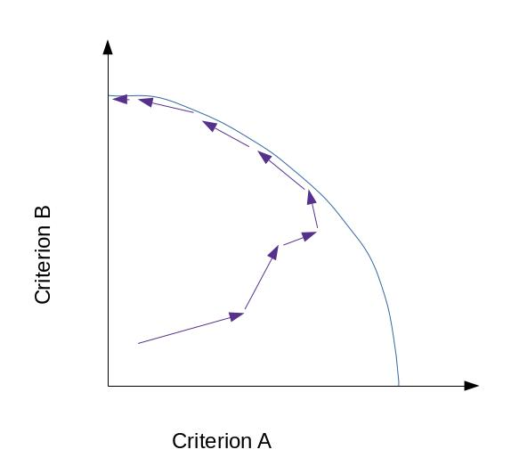 What this looks like is that if you’re near or on the Pareto frontier there are few to zero ways to improve all criteria and as you get further away there are more options for improving all criteria. Iteratively then you can imagine that around every point there are some known ways to move that may be visualized as vectors from that point. A sequence of such changes is then a sequence of movements along vectors. Generally what you’d expect (with caveats) is that the trajectory moves up and to the right until it hits the pareto optimal frontier and then skates along the frontier till one or the other optimization process wins or they are at equilibrium (relatedly).