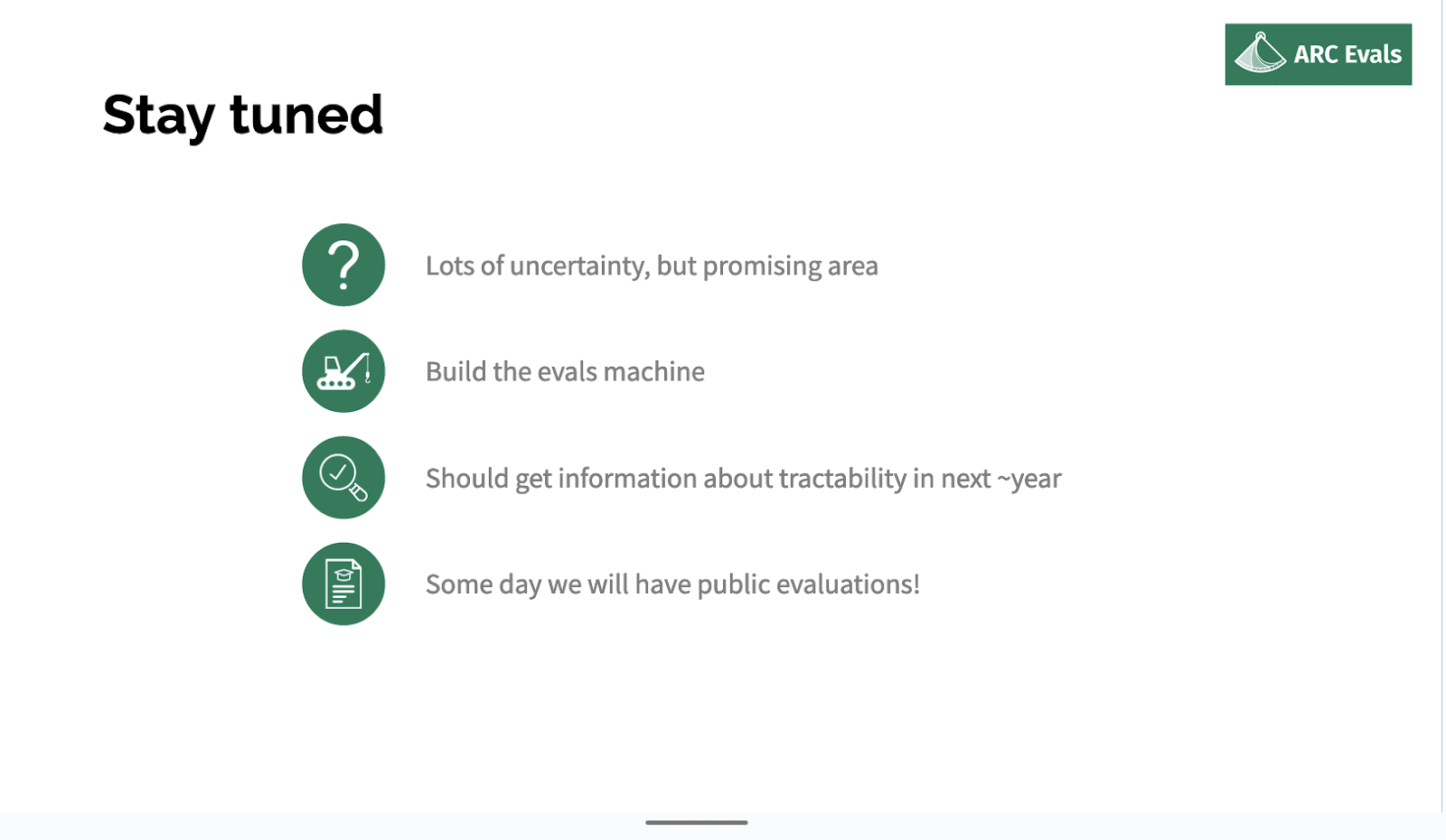 So in general I’m not sure exactly what the path is here and exactly what the impact mechanism is, but I’m more confident that it definitely seems like there is something in this direction that is going to be useful, and we are just going to generally try and go in that direction and try and build a team that is good at doing these kinds of evaluations, build an ecosystem of a lot of different groups who can do different sorts of evaluations targeting different threat models, and have this machine ready for the point at which it’s like: okay, we need to think about new threat models from this generation of models, we need to build tools to work with these models, we need to have a bunch of people who are experts in interacting with models, sit down with them and do kind of model psychology or whatever.