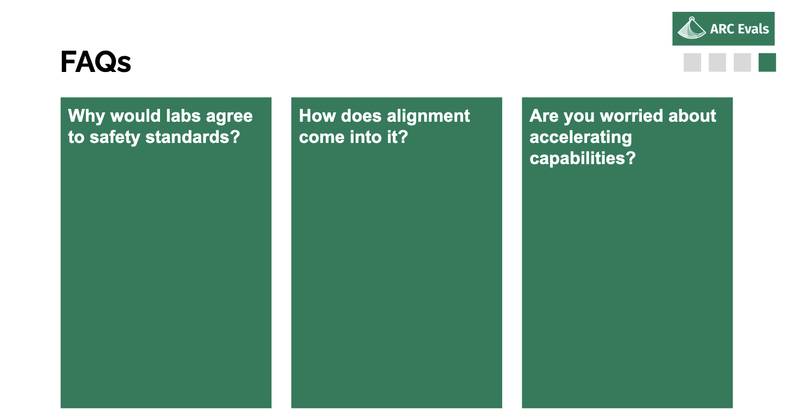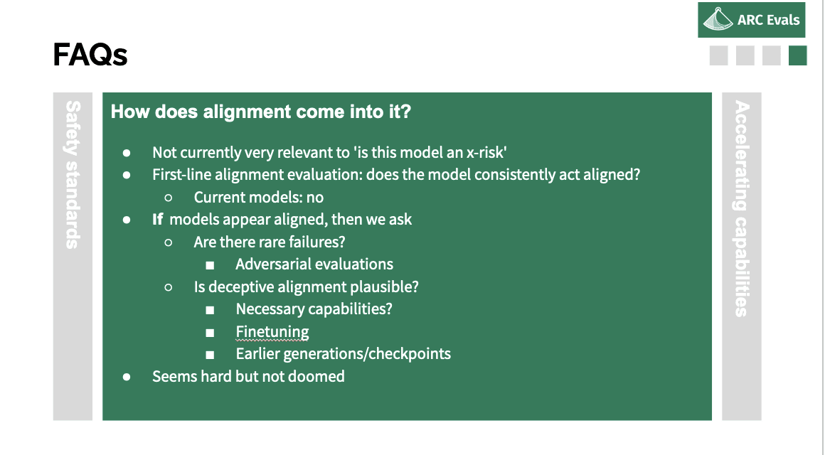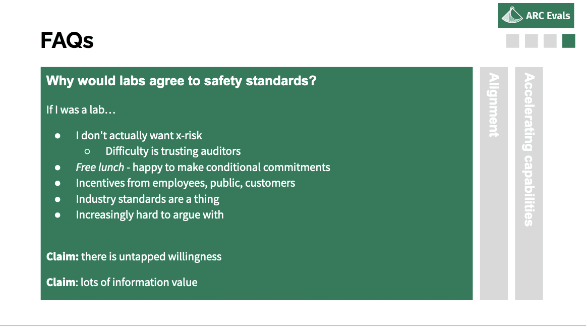 So having outlined that, here are some questions I get asked about the eval stuff. First one is: why would labs agree to this? That’s a key part of this plan: why would this happen? Second is: you haven’t mentioned alignment at all, what’s up with that? And the third one is concern about actually doing harm via doing these kinds of evals and accelerating dangerous capabilities.
