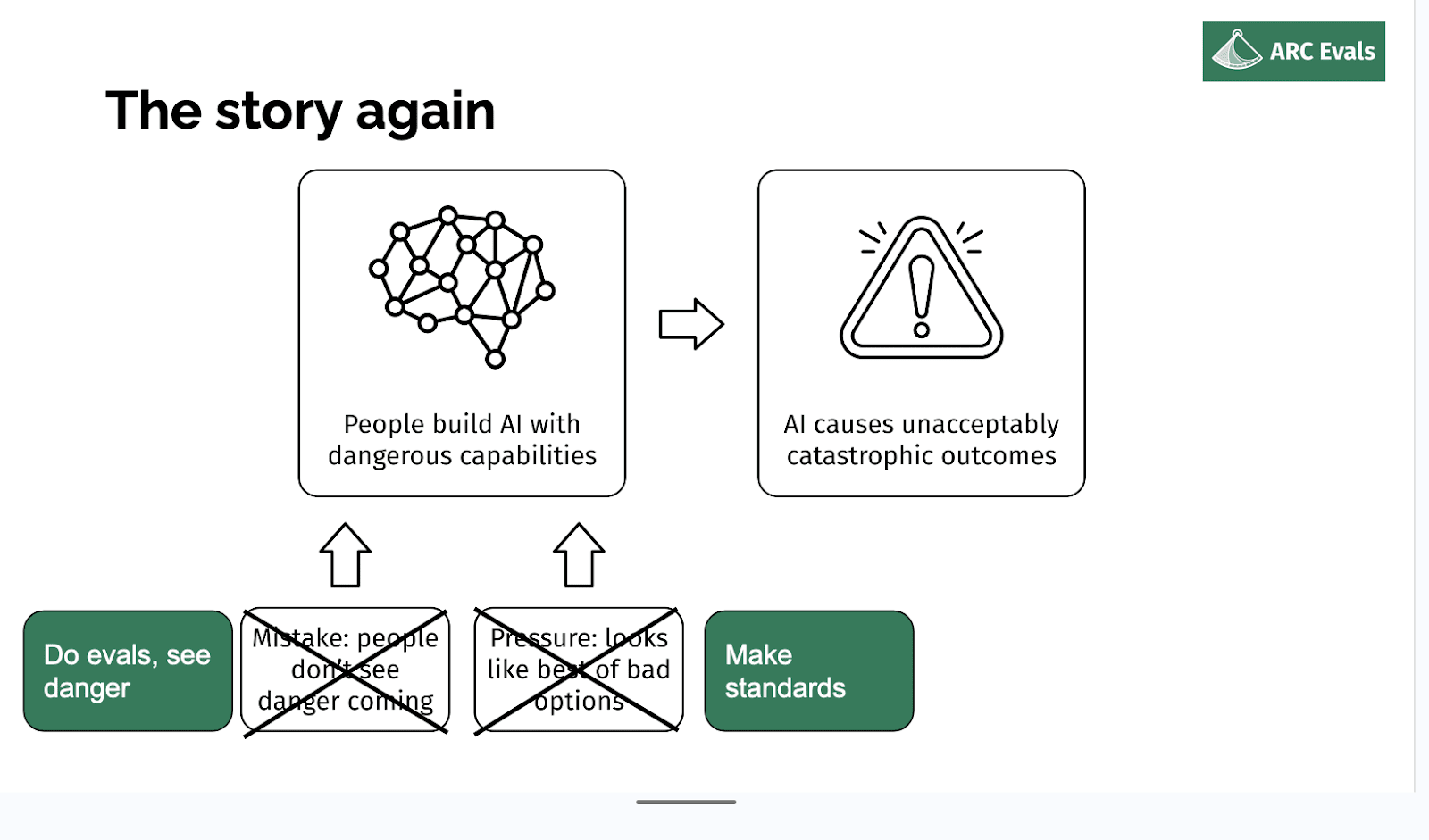 So if we are in fact able to tell if a given model, training run, deployment, is an x-risk, we should be able to rule out both of these parts, basically. The first one is obvious: if we can check if the thing is an x-risk and tell if it is, then no one’s going to think the thing is safe incorrectly. And if we can make those evaluations concrete and specific enough that they could be something that people can agree to, like ‘conditional on this being reached, then we’ll do this sufficient safety mitigation’, then you can reduce this aspect of pressure because you [don’t] think other people are going to do a dangerous thing if everyone has agreed to the standard that precludes doing dangerous things.