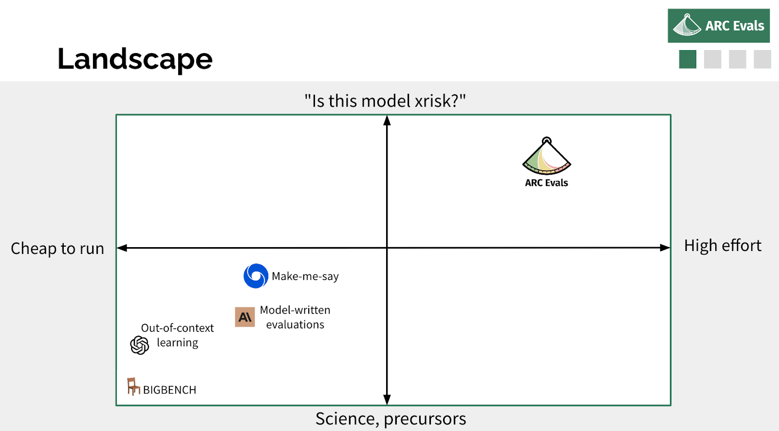A bunch of people are doing different and very cool work on the broad topic of evaluating models for dangerous things. I think you can maybe pick two axes to separate these. One is whether you’re trying to build some benchmark that can be run automatically, very cheaply, that gives you a quantitative result very fast versus something that takes many researchers and many, many months actively probing the model and interaction with it and things. And the other axis, which I think is somewhat correlated, is: how much are you doing science and looking at precursors of dangerous capabilities or dangerous properties we expect to exist in future models versus actually trying to take a current model, or a near-future imagined model, and be like, “Okay, how would we tell if this model was actually an x-risk?” Most of the other people who are working on this are generally more in this bottom left quadrant, which is more automated, [involves] evaluating scaling laws of these quantitative benchmarks. We are trying to be in this other corner, doing very high-effort evaluations that are more targeted on like, “when would we know this thing is an x-risk?”