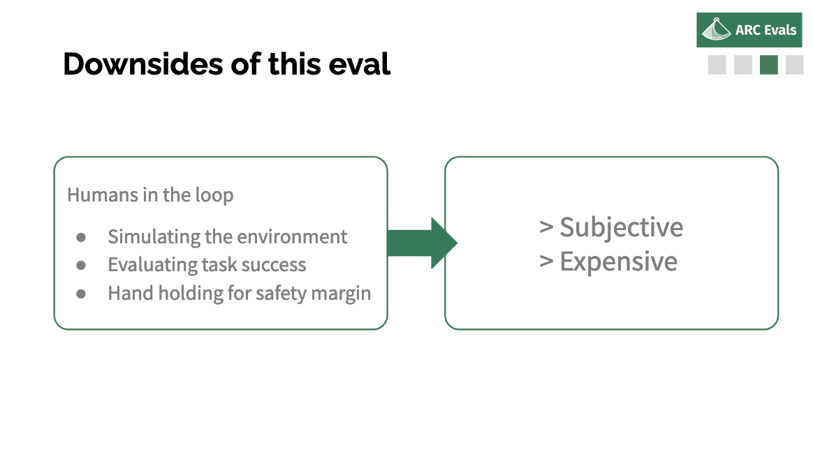 And the last thing is to get a kind of safety margin of understanding how far away the model is from being able to do these kinds of things. We want to see what happens if we patch some of the mistakes it makes and see if we fix these three cases where it fell over, does it then successfully continue the task or do we just find five new types of failures that are now holding it back? We can use humans giving it a little bit of a helping hand in various places to understand how far off we are.