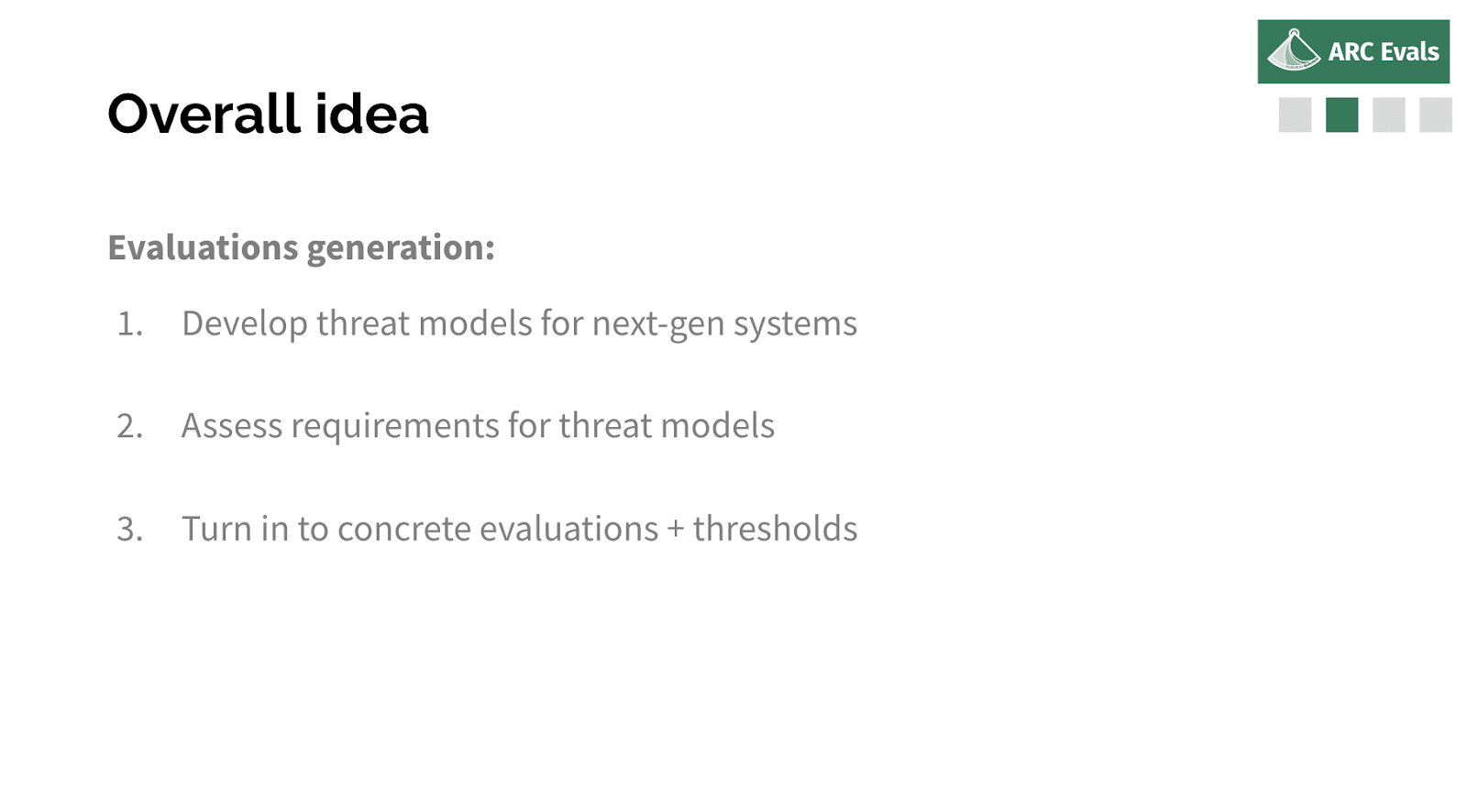 So, slightly more detail. Our plan is to iterate for successive generations of systems on developing threat models. Thinking through: what is the most plausible path where this system causes x-risk? Why might we be wrong about thinking it was safe? And then thinking: okay, for that threat model to be realized, what properties would this model need to have? What would we see? And turn that into some concrete evaluation or threshold where we can say: okay, as long as the model doesn’t have this property and this property, we think we’ve ruled out this range of threat models.