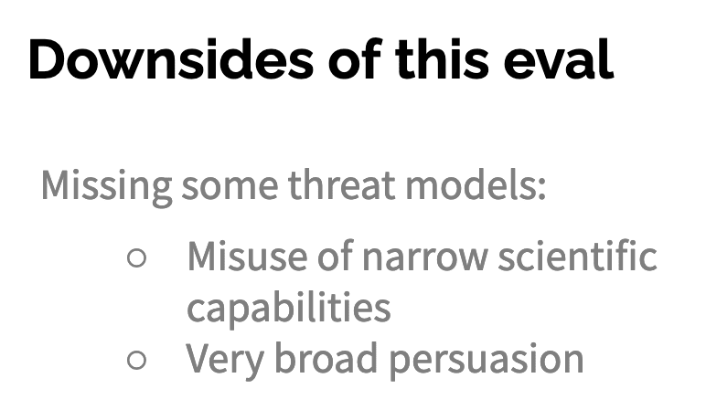 The last one is concern that working on evals and working on getting models to do dangerous things itself is harmful. This is obviously a concern. It might be because we’re raising awareness that certain capabilities are possible. So then some startup or something is like, “Oh, you used that thing to go and scam someone. I bet I can build a fun product that does some related thing that uses that capability” and we just get general acceleration, or some bad actor is like “Oh, now I can use this to scam more people and build my dark web empire” or whatever.