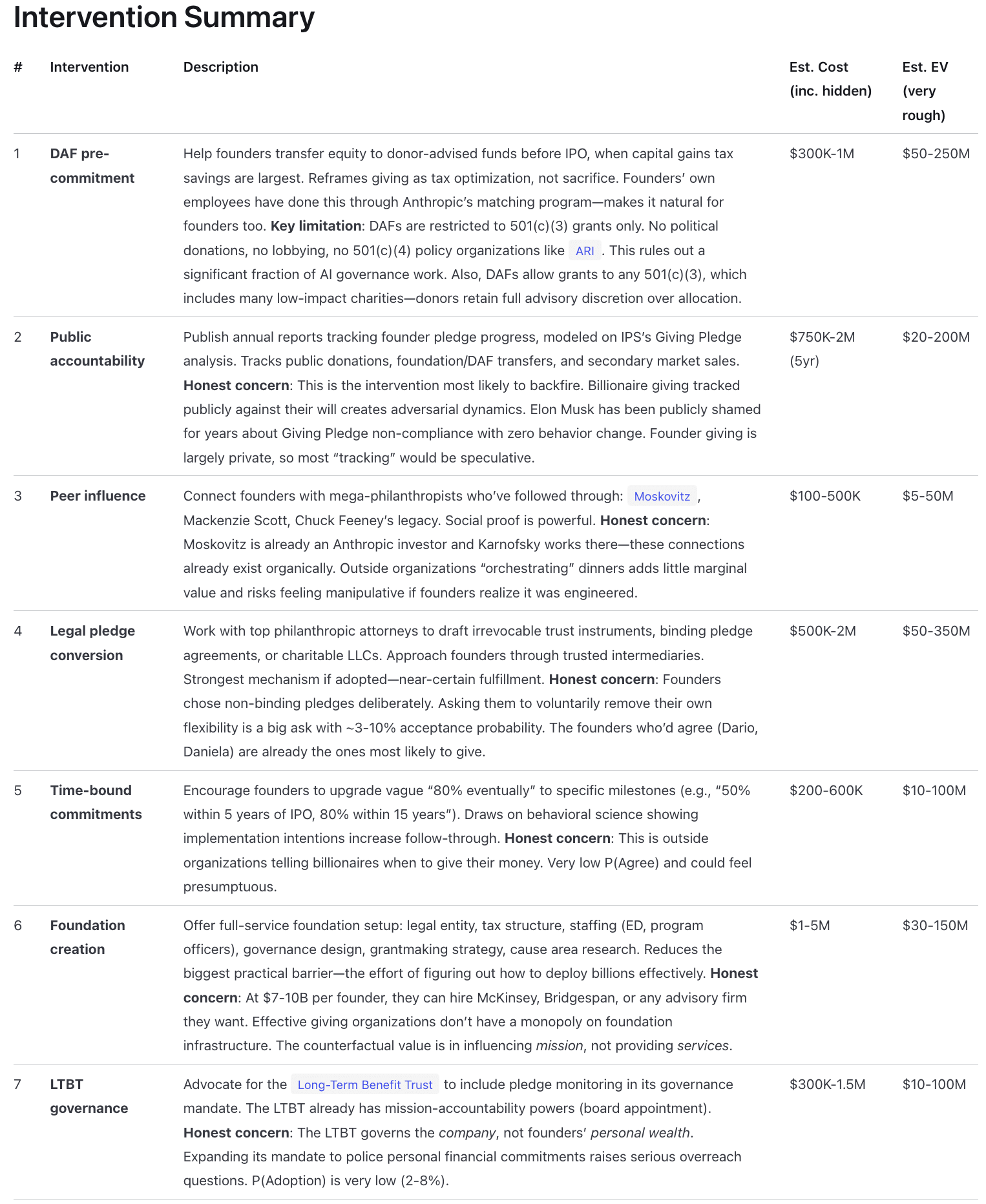 I’m going to guess the total donated will be 30% of this by EA funders, and a low percentage by the rest. I think your conservative number is WAY too low based on previous pledge fulfillment rates. I get that it’s just a claude generation though