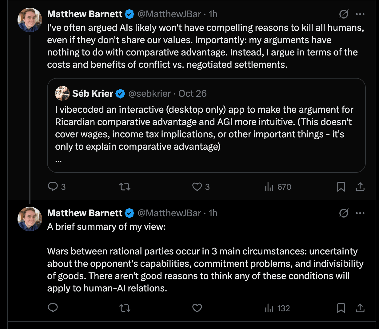 Our starting point will be these tweets from Matthew Barnett of Mechanize, a startup producing RL environments for LLM training and mildly controversial essays on the trajectory of AI and automation of labour. Matthew is generally pro-accelerating AI development as quickly as we can.