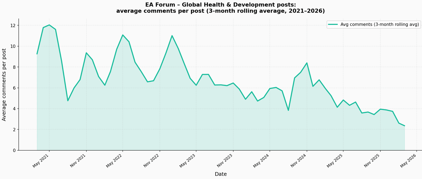 Thanks for writing this Nick—the comments/post graph is really useful to me and definitely dismaying to see. I wonder what the trends look like for other cause areas (I might try and figure out how to claude code an answer to that myself).