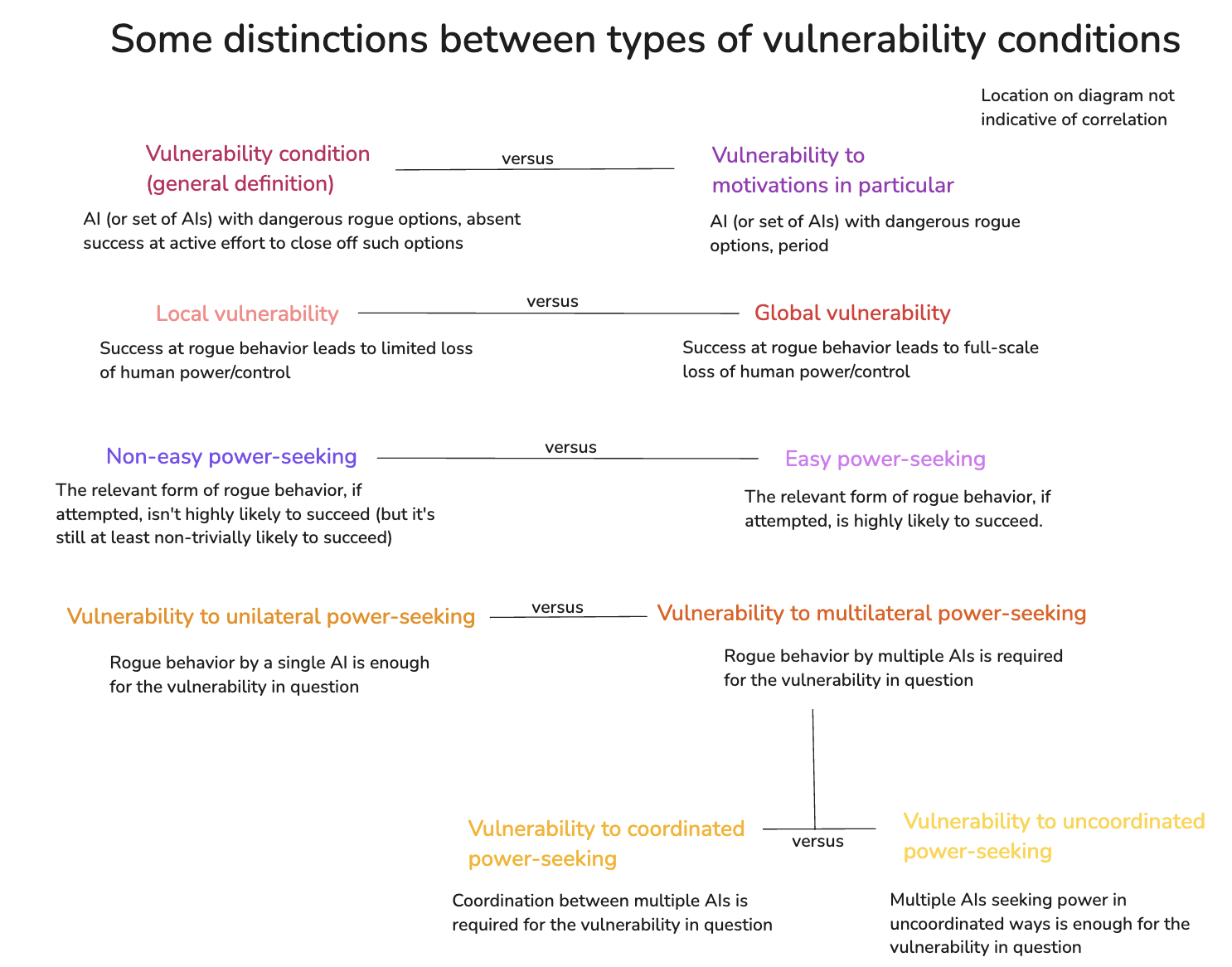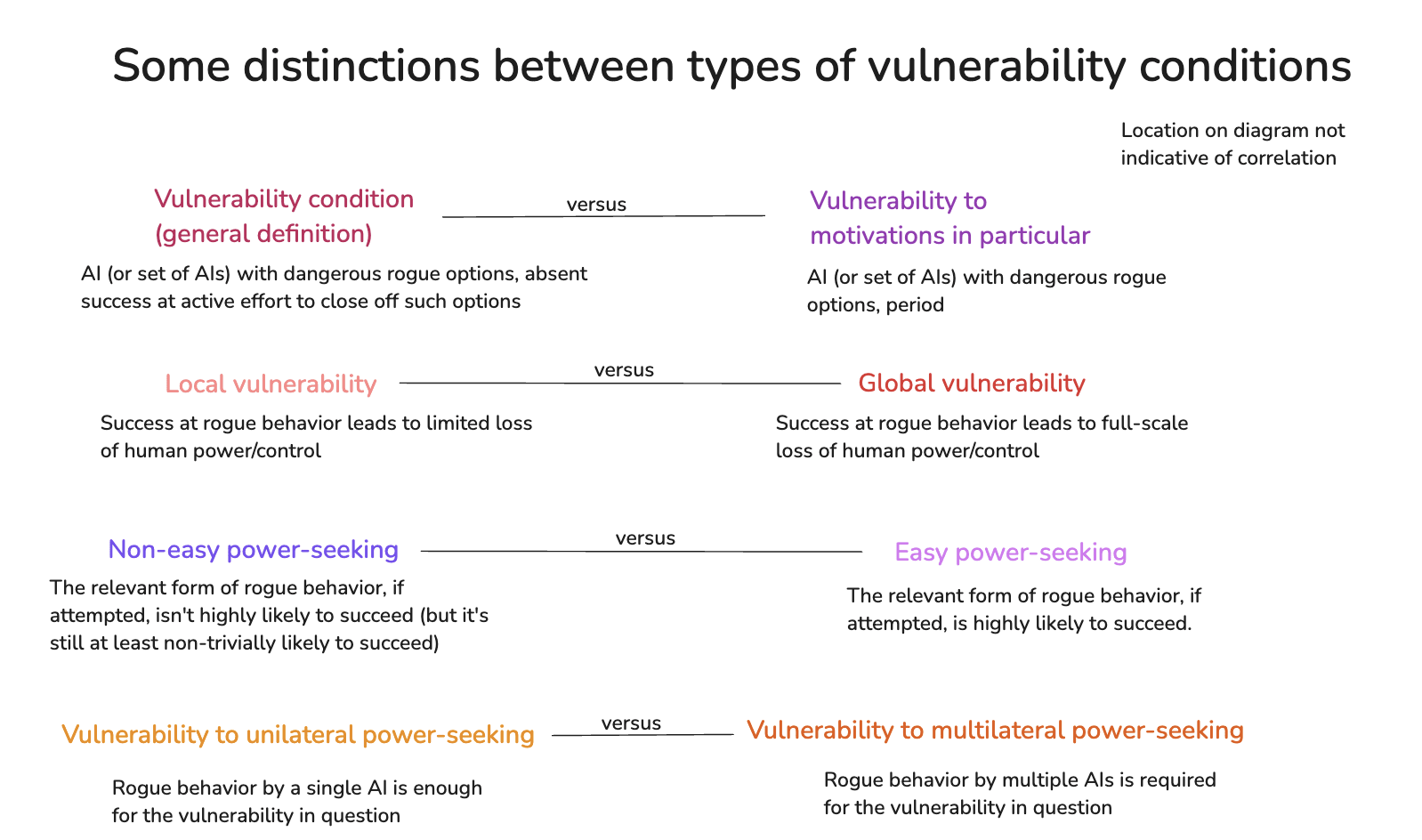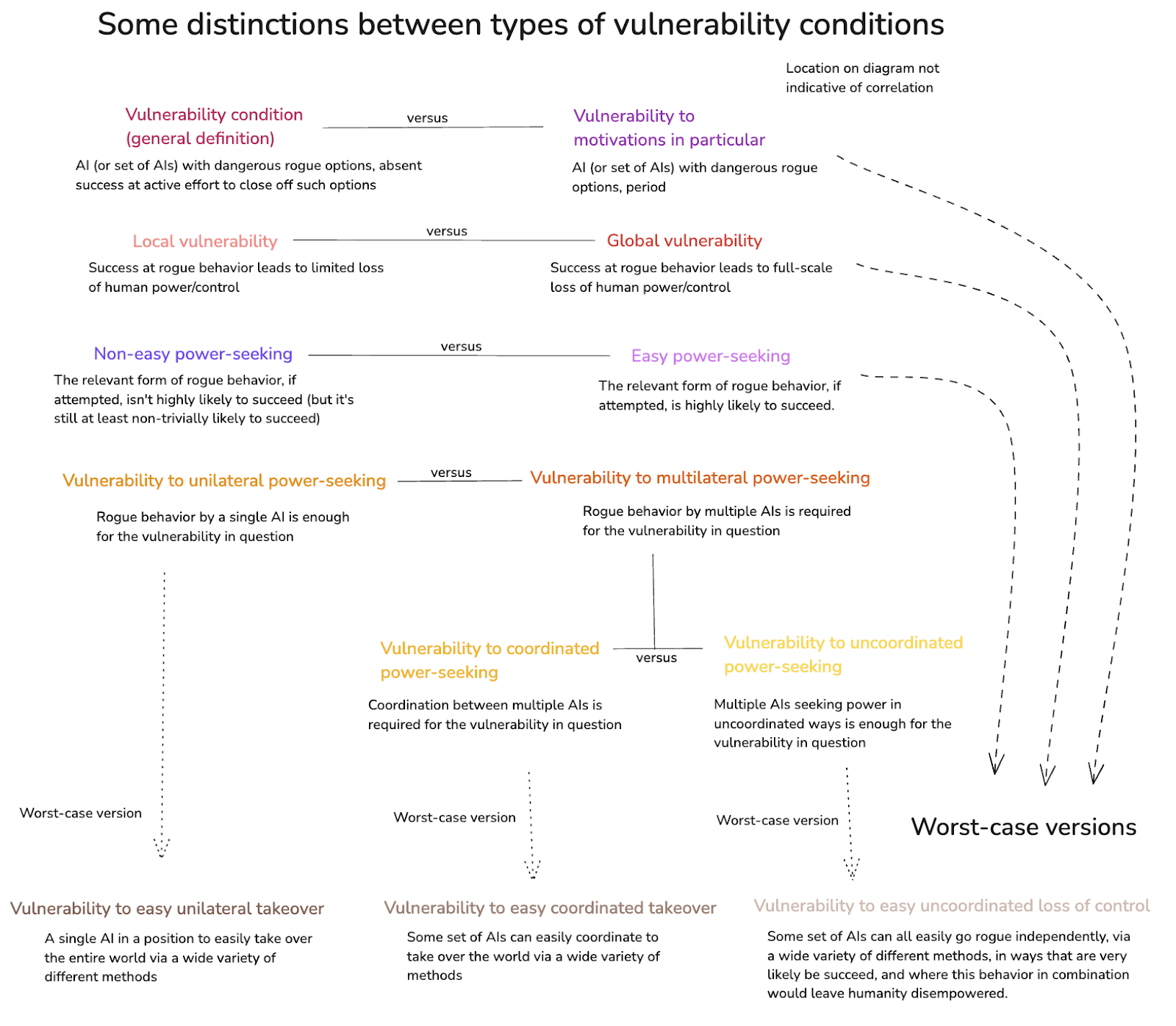 That said: a single AI agent with a decisive strategic advantage is an extreme case of a broader class of scenarios, which I’ll call “global vulnerability conditions.” These are conditions in which humanity’s continued empowerment rests on some combination of (a) the success of our active efforts to restrict the options available to our AIs, and (b) these AIs not choosing to seek power in problematic ways, despite having options for doing so with a substantive chance of success.