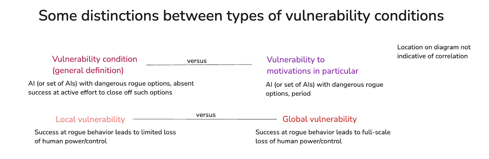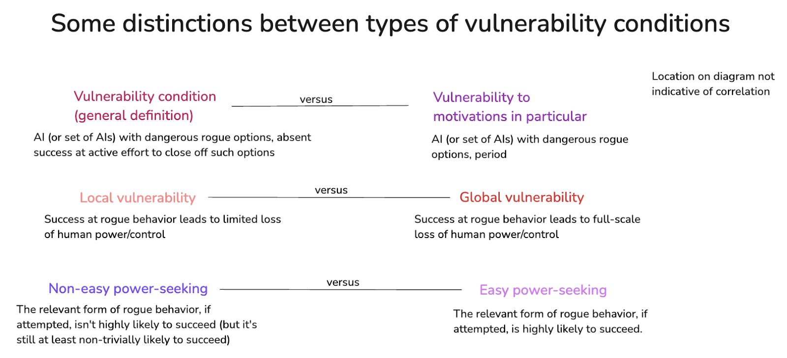 In principle, we could define vulnerability conditions as: conditions where you need to be engaged in both active option control and active motivation control in order to prevent rogue behavior. But I think it’s much more complicated to analyze whether we are in fact headed for these sorts of scenarios. And I think the idea that it’s up to the AIs whether or not to disempower humans should be enough to get us worried.