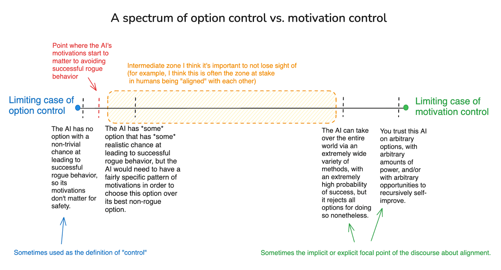 In my opinion, the AI alignment discourse has thus far focused too much either on extreme cases of motivation control (e.g., AI systems we trust on ~arbitrary options and with ~arbitrary amounts of power[16]), or on extreme cases of option control (e.g., our safety is robust to the AI systems having arbitrarily bad motivations[17]). But the framework above highlights the many possible approaches in between – i.e., ensuring that the properties of the specific set of options available to the AI (e.g., the nature of the best non-rogue option, the pay-out for success at rogue behavior, the path, the failure modes, the probability of success) and the specific motivations the AI is using to evaluate these options (e.g., its satisfaction, ambition, inhibition, failure-aversion, etc) combine to make non-rogue behavior the more rational choice (more detailed examples in footnote).[18]