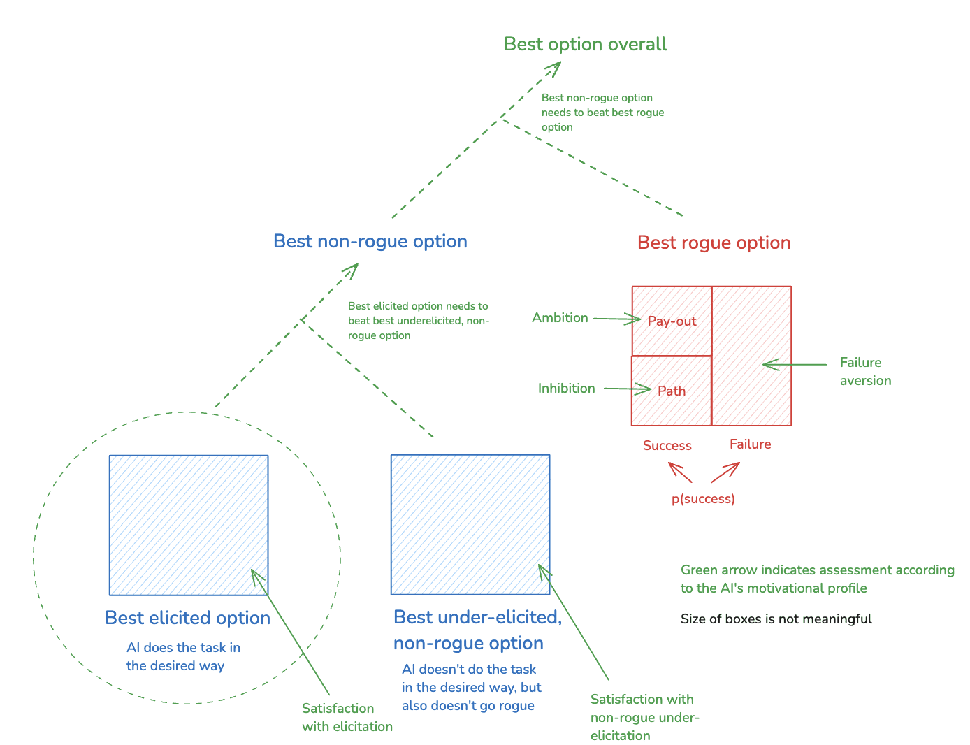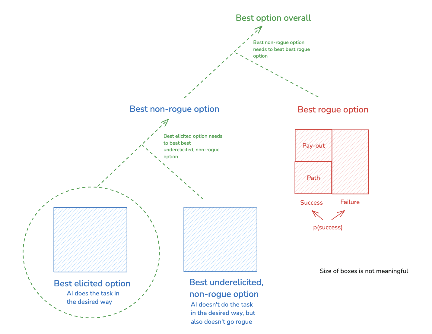 We can simplify an AI’s choice to go rogue into a choice between two options: its best rogue option, and its best non-rogue option.[10] And we can break up its best rogue option into the following components: