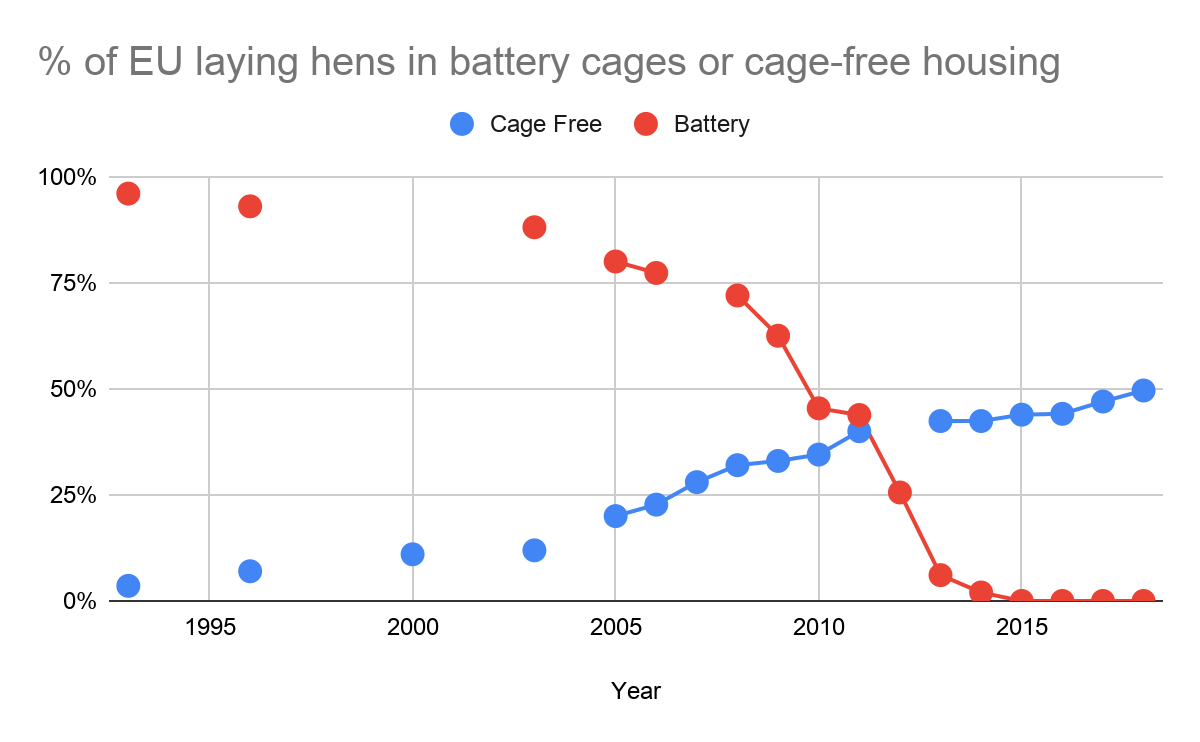 There is not very reliable year-on-year data for the percentage of EU hens in conventional battery cages unfortunately. However, using the limited data available, which includes projections by official sources and numbers reported by media sources, there is a clear downward trend. Note that in the 10 years between 1996 and 2006 there was a 17% reduction in conventional battery caged hens, while after 2010 there were similar or higher rates of reduction within a single year. This is slightly confounded by the addition of numerous countries into the EU who had majority battery cage systems in 2004.