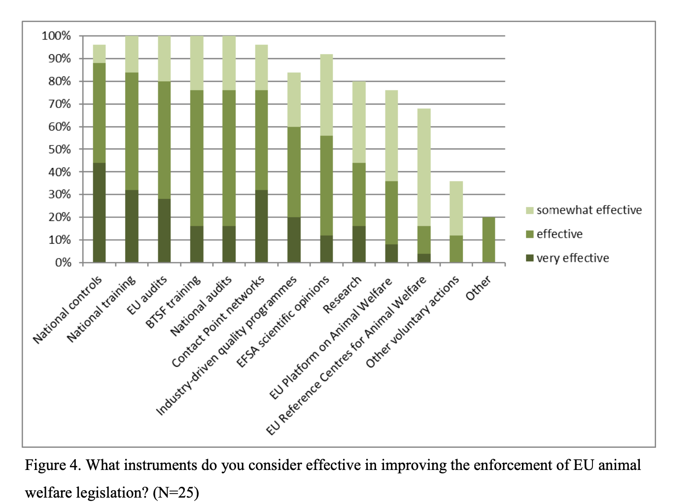The next obstacles are insufficient knowledge, financial constraints, and “lack of control resources”, which refers to inspections (EU Platform on Animal Welfare, 2019).[14] The same survey showed which enforcement methods were considered to be effective tools (see second figure below), such as national inspections (88%), national audits (76%) and EU audits (80%) (Council of the EU, 2020). Enforcement barriers are, in reality, about failures of member states to properly apply and enforce EU law.