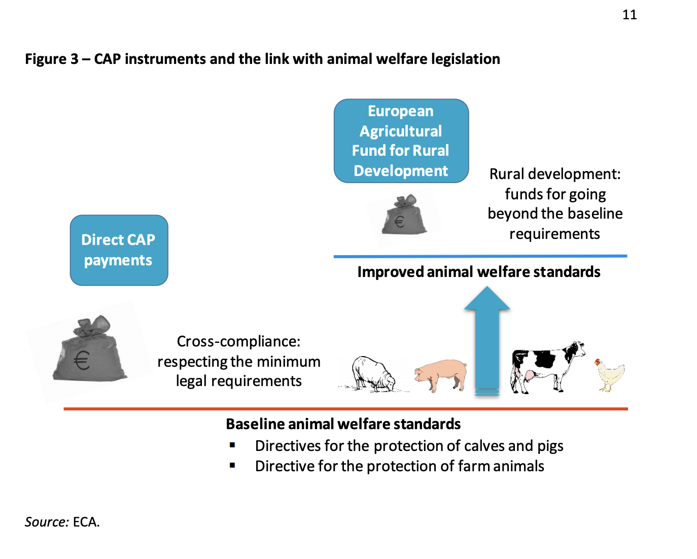 In economic terms, animal welfare is not very important for farmers’ production decisions because while no costs are attached to the degradation of animal welfare, as long as the welfare level does not affect productivity, costs are often associated with improving animal welfare. The EU provides some financial instruments to compensate producers for higher production costs and to incentivize reform. A discussion of the problems in this system and how to reform it merits a much more substantial discussion than can be provided here, so instead we lay out the basics of how the system works today and some issues specific to animal welfare.