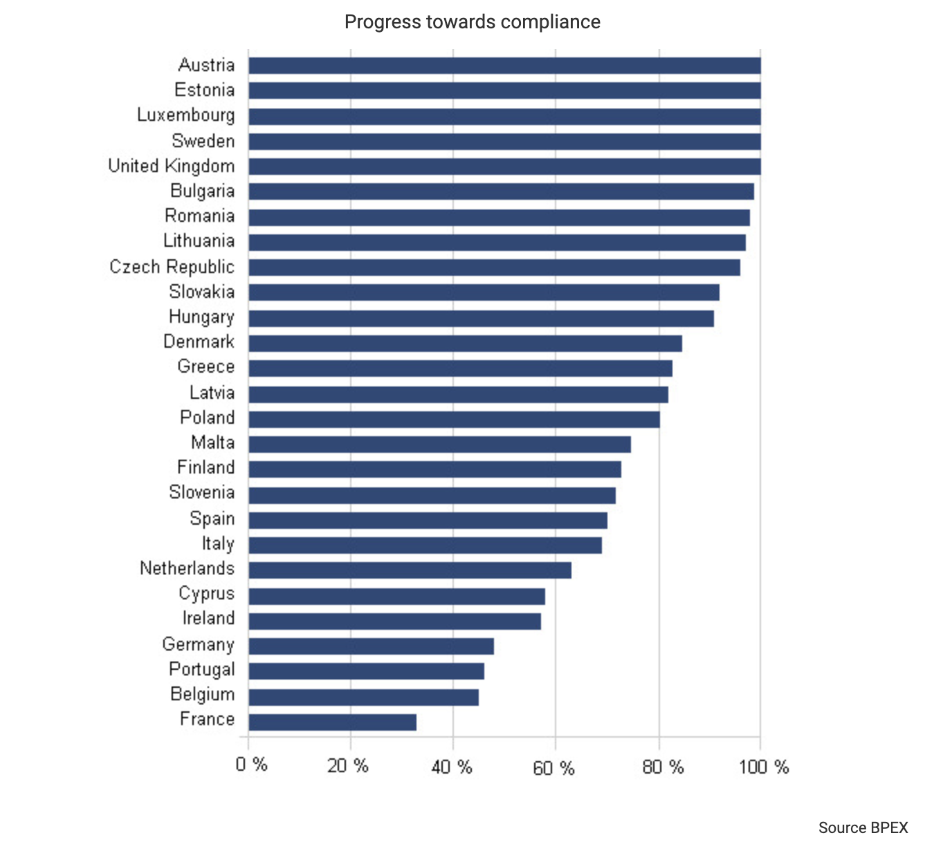 Commissioner Dalli said inspection teams were ready to go “all out” from January 1, 2012 with increased surveillance targeted at noncompliant member states based on submitted lists of compliant and noncompliant producers (EC, 2011a). Reviewing the DG SANTE reports from 2012, nine countries were visited after the deadline,[47] though not all of these were listed as noncompliant so it is unclear whether the inspections themselves or fear of inspection actually induced compliance, if they did at all. Reportedly inspections of the 13 member states that missed the deadline were postponed because they would only have proved what these countries had freely admitted (FarmingUK Team, 2013).