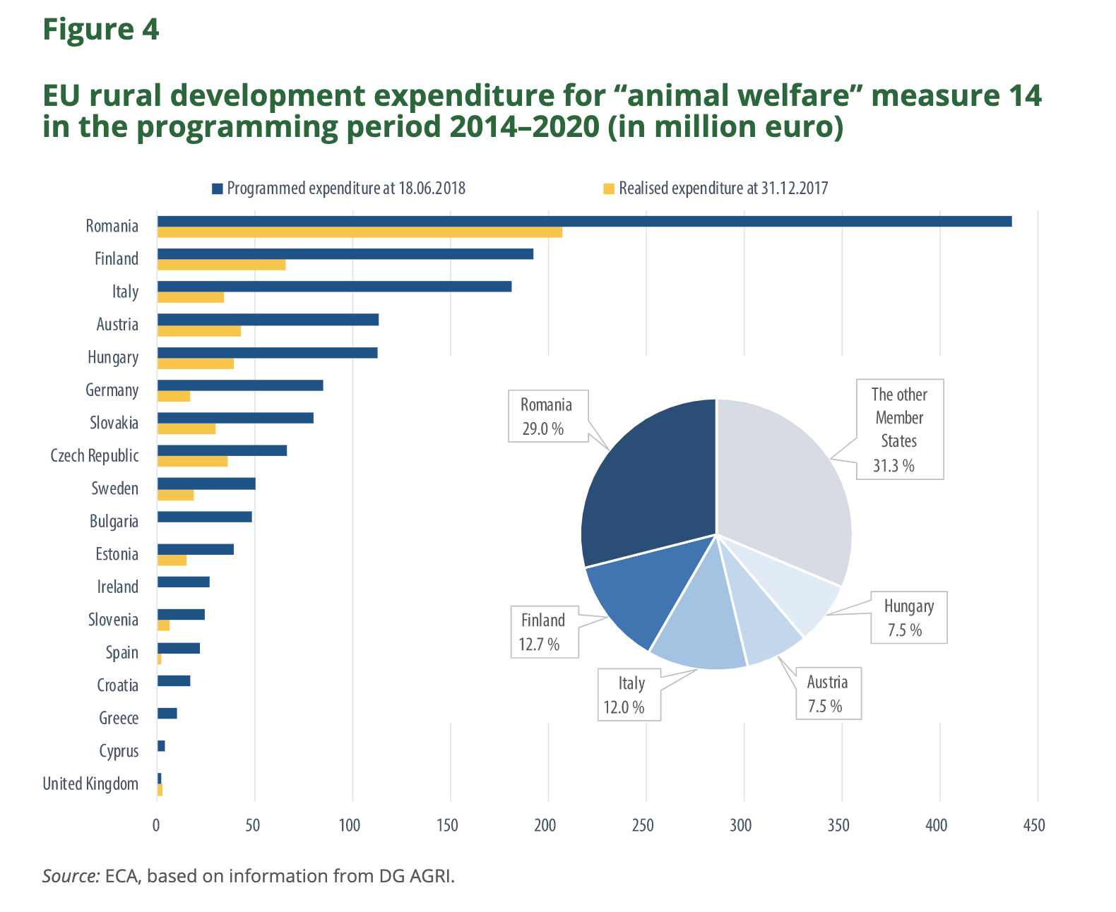 Member states also can draft Rural Development Programs to draw on funds from the EU based on a set of measures set out by the EU. Countries themselves define the conditions applied to the measures included, which may include Measure 14: “promoting food chain organisation, animal welfare and risk management in agriculture”, but it is not mandatory. These programs are then approved by the Commission. For the 2014–2020 period, the funds allocated to the animal welfare measure of the Rural Development Funds account for €1.5 billion (1.5 % of the total EU rural development funds), an increase from the €1 billion in 2007–2013 (ECA, 2018). 10 member states have not used the rural development funds for animal welfare in the most recent reporting period. It may be understandable that countries omit animal welfare conditions from their programs altogether because there may not be enough of a market for farmers to transition to higher welfare standards and maintain competitiveness regardless of transition costs being covered, or that countries simply have other priorities when designing these programs. However, even among those who do include animal welfare conditions in their programs a lot of the available money appears to simply be left on the table, as can be seen from the difference in programmed and actual expenditure in the figure below (ECA, 2018). One plausible explanation is simply that some countries do not have the institutional capacity to effectively apply for and distribute these funds in what is often a huge and complicated bureaucratic system.