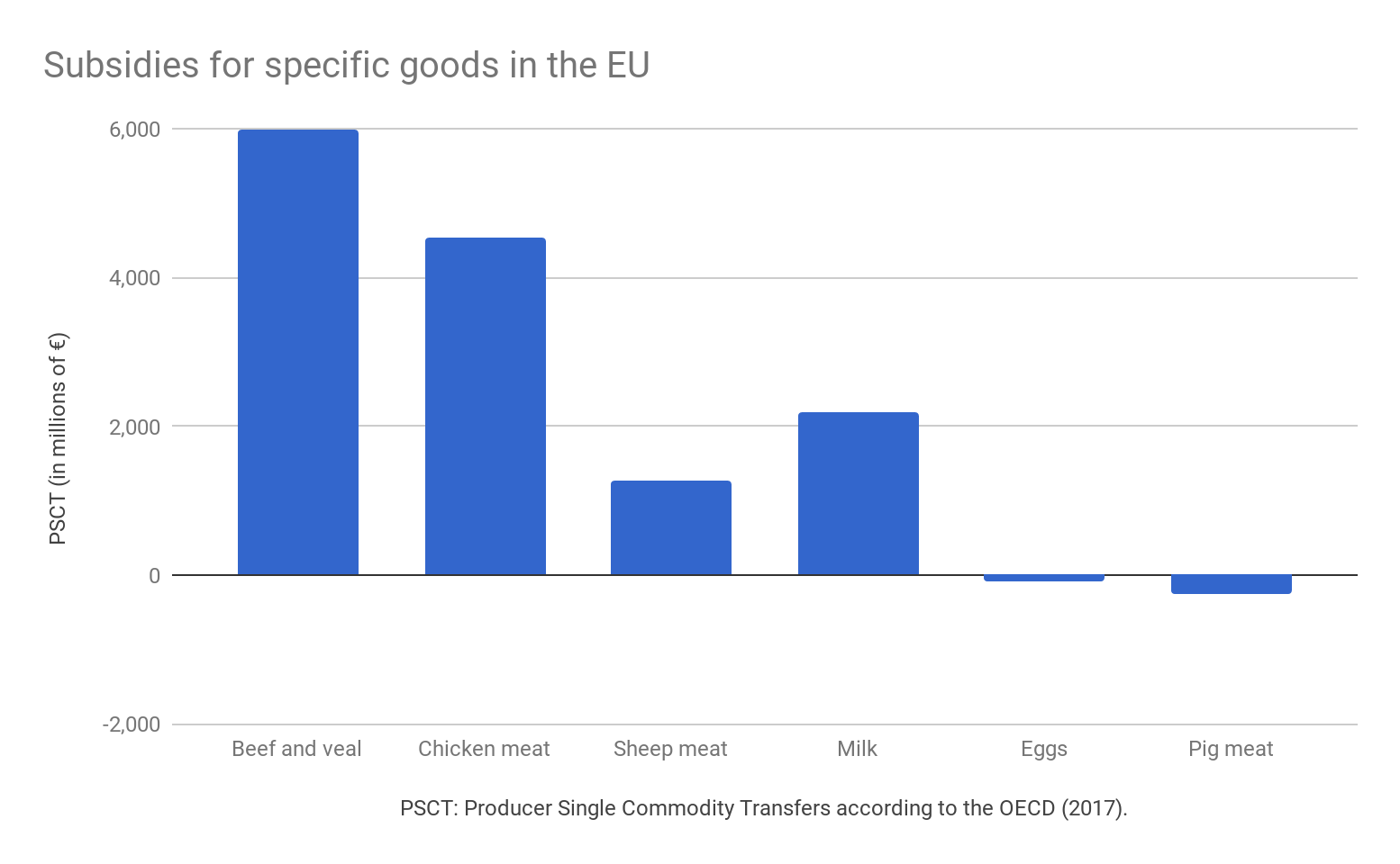 The main purpose of CAP direct payments is to provide income support to farmers to compensate them for the public goods and services they provide (minimum of €196 ($227 USD) per hectare), not to directly support animal welfare. Few countries make use of the CAP tools to address animal welfare objectives[18]. In fact, CAP payments have served to produce large quantities of animal products at an artificially lower cost, encouraging higher consumption. Rethink Priorities researcher Daniela R. Waldhorn calculated how much money the EU transferred to farmers for the production of specific animal products in 2016, as shown in the figure below.