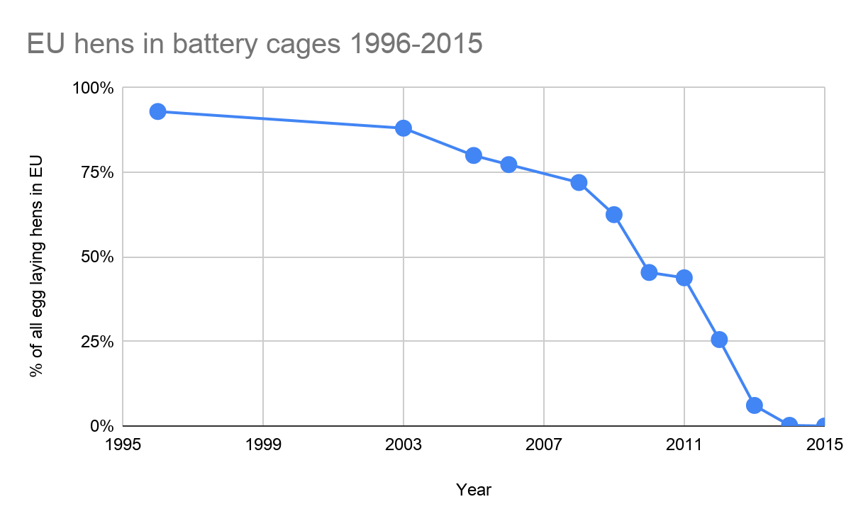 In 1996, 93% of the 271 million hens in the EU were housed in conventional battery cages (EC, 1998). In an ideal world following the letter of the law automatically, the expected number of hens in such cages would’ve been 0 in 2012. It was estimated in 2006 that there would still be at least 150 million hens kept in conventional battery cages by 2012 (FAWC, 2007). In 2010 this estimate was revised to be 100 million hens still being kept in battery cages by 2012 (Agnew, 2010). In reality that number was estimated to be 46–84 million (14–30% of total EU egg laying hens) by the time the deadline for the ban came along,[30] which suggests something changed that sped up the transition in the interim for 64–104 million hens (assuming the estimates in 2006 and 2010 were based on reliable data). 13 member states were found to be in breach of the ban in 2012, but by 2013 there were only allegedly 800,000 hens in conventional battery cages (0.2% of total EU egg laying hens) (EC, 2014) and by 2014 there were 0, in farms with more than 350 hens (EC, 2015).