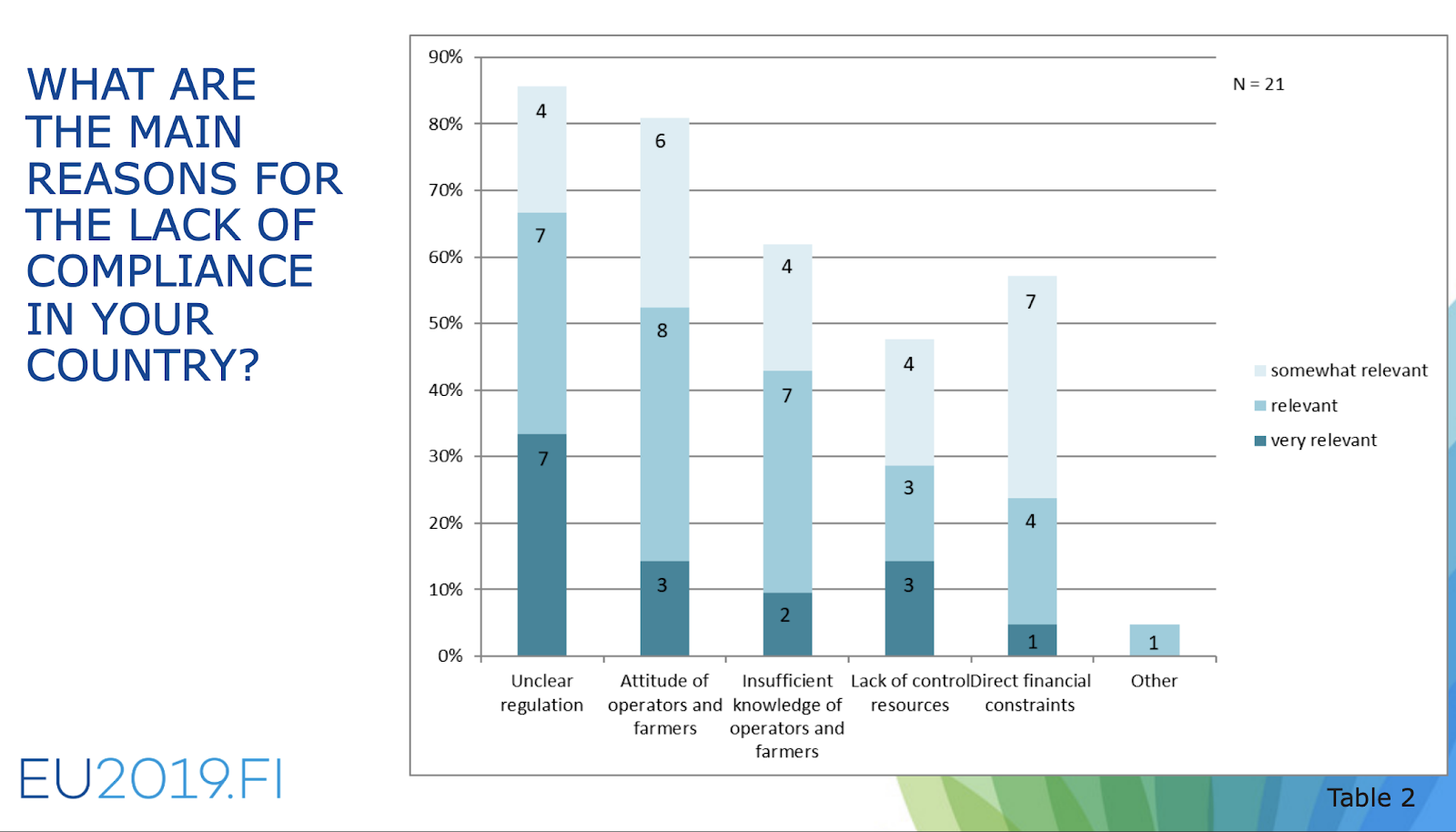 According to a 2019 survey of Chief Veterinary Officers[13] from EU member states (see figure below), unclear regulations and farmer attitudes are the most relevant reasons for noncompliance in animal welfare (Council of the EU, 2020). After reading various reports from EU audits of national inspections systems these farmer attitudes appear to be that farmers believe that other producers are not following the rules, that farmers do not understand the purpose of the legislation, or they see the proposed measures as incompatible with industrial farming.