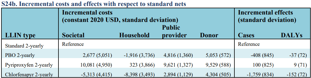 Mosha et al. (2022)[22] conducted CEA for all LLIN types, using results from the first two years of their Tanzania trial. They ran Monte Carlo simulations using estimated distributions of parameters (both for benefits and costs). All total benefits and costs below are for a hypothetical cohort of 10,000 people covered (1.7 per LLIN).