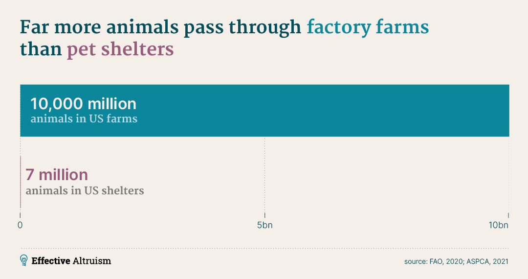 Molte persone sono d’accordo sul fatto che non dovremmo permettere che gli animali soffrano inutilmente, ma questo genere di attenzione è perlopiù diretto verso i rifugi per animali domestici, come gattili e canili. Eppure, negli Stati Uniti, il numero di animali negli allevamenti intensivi è circa 1400 volte più grande di quello degli animali nei rifugi.[18]