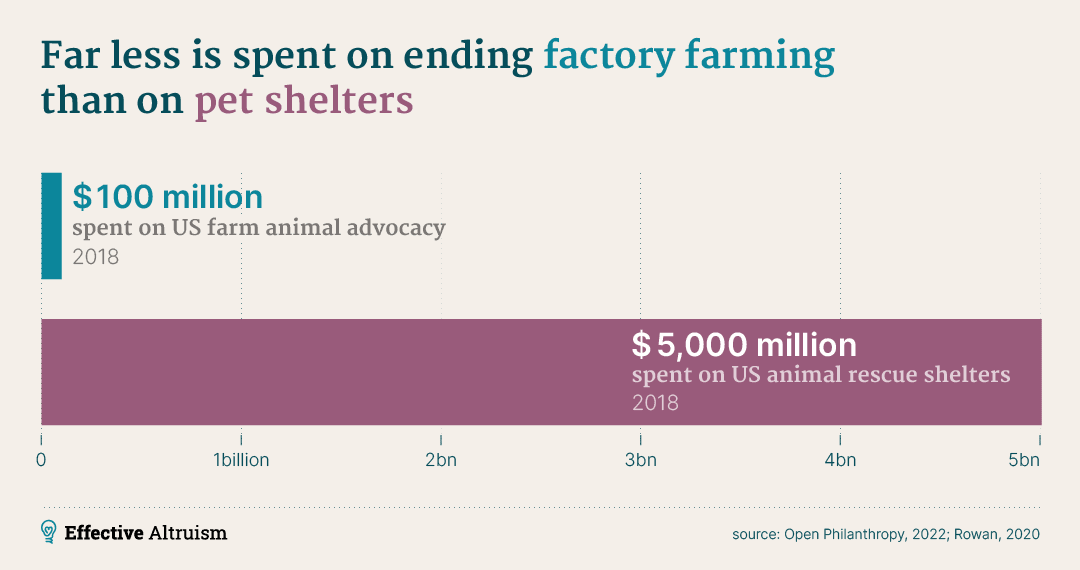 Spese per i rifugi per animali: Andrew Rowan stima 5 miliardi di dollari in finanziamenti ai 3000 più grandi rifugi per animali negli Stati Uniti nel 2018, nel suo paper “Cat Demographics & Impact on Wildlife in the USA, the UK, Australia and New Zealand: Facts and Values” Rowan et. al. (2020), Journal of Applied Animal Ethics Research, pagine 7–37. Andrew Rowan ha confermato i dati alla base di questi calcoli in una conversazione privata. Finanziamenti ai gruppi di difesa per i diritti degli animali: Una ricerca per Open Philanthropy disponibile qui fornisce i seguenti finanziamenti ai gruppi di difesa per i diritti degli animali da allevamento nel 2018: