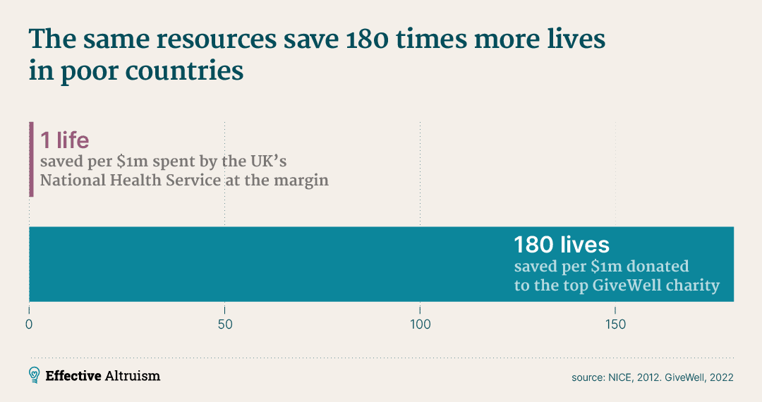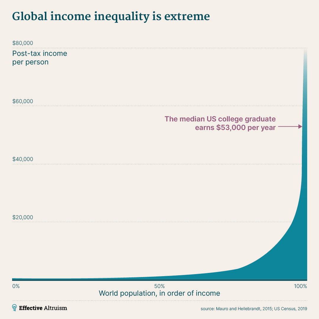La disuguaglianza a livello globale è terrificante. Per via di questa situazione, dare risorse alle persone più povere del pianeta può portare enormi benefici. In paesi più ricchi come gli Stati Uniti[9] o il Regno Unito i governi di solito sono disposti a spendere più di 1 milione di dollari per salvare una singola vita.[10] Ne vale assolutamente la pena, ma nei paesi più poveri del mondo il costo per vita salvata è decisamente minore.