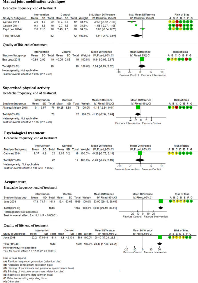 Results: The overall level of certainty of the evidence was low to very low. Manual therapy techniques and psychological treatment did not change the studied outcomes. Supervised physical activity might have a positive impact on quality of life, acupuncture on headache frequency, intensity, quality of life and the use of attack-medicine. Patient education might improve self-rated health and quality of life and increase the number of well-informed patients.