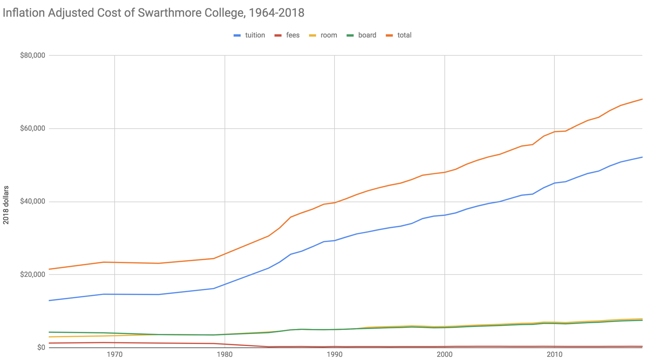 Before we can get into figuring out approaches, though, how much is college likely to cost? My kids are two and four, so letās say the mid 2030s? Letās start concrete and look at how prices have been changing at the college I went to (Swarthmore), adjusted for inflation: