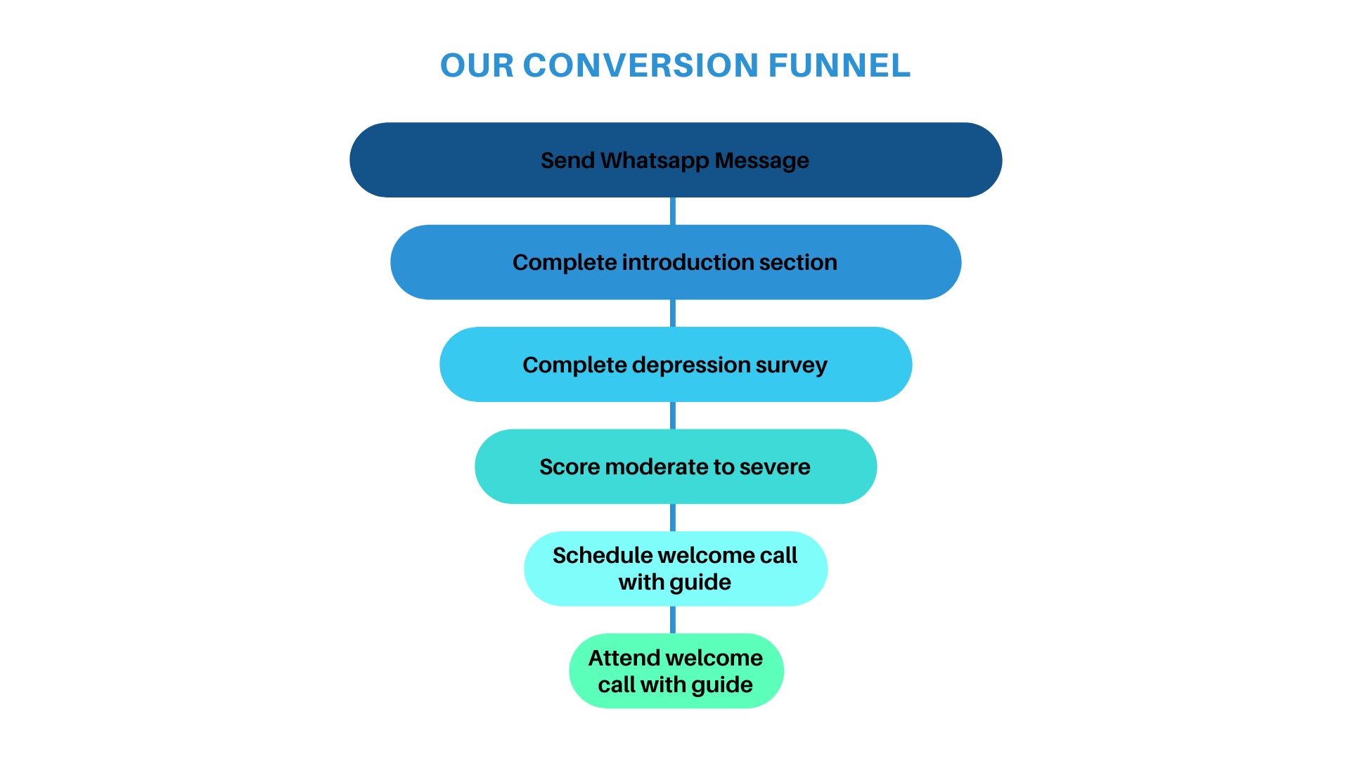 Individuals had to be interested enough in joining the program to fulfill each of the steps in the process below, each of which represents a dropout point. 12% of people who sent an initial message to the bot- knowing little about the program- completed all of these steps and were moderately to severely depressed.