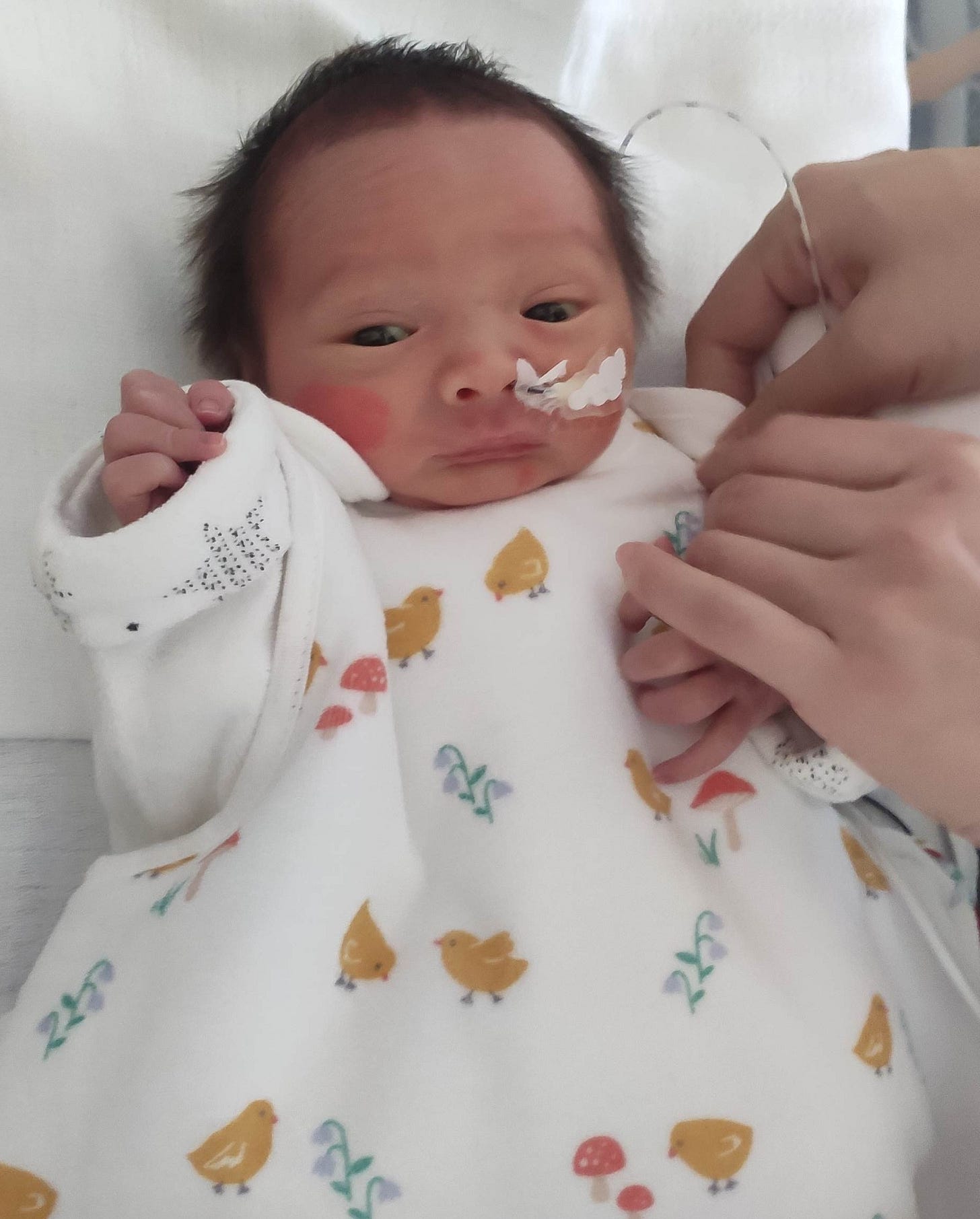 Despite looking relatively calm when sleeping or being held, there’s never any sign of happiness, comfort or recognition. This continues, and his life for the first week is a cycle of fragile stability made tragic by omnipresent tubes, monitors, and moments of genuinely life-threatening anguish.