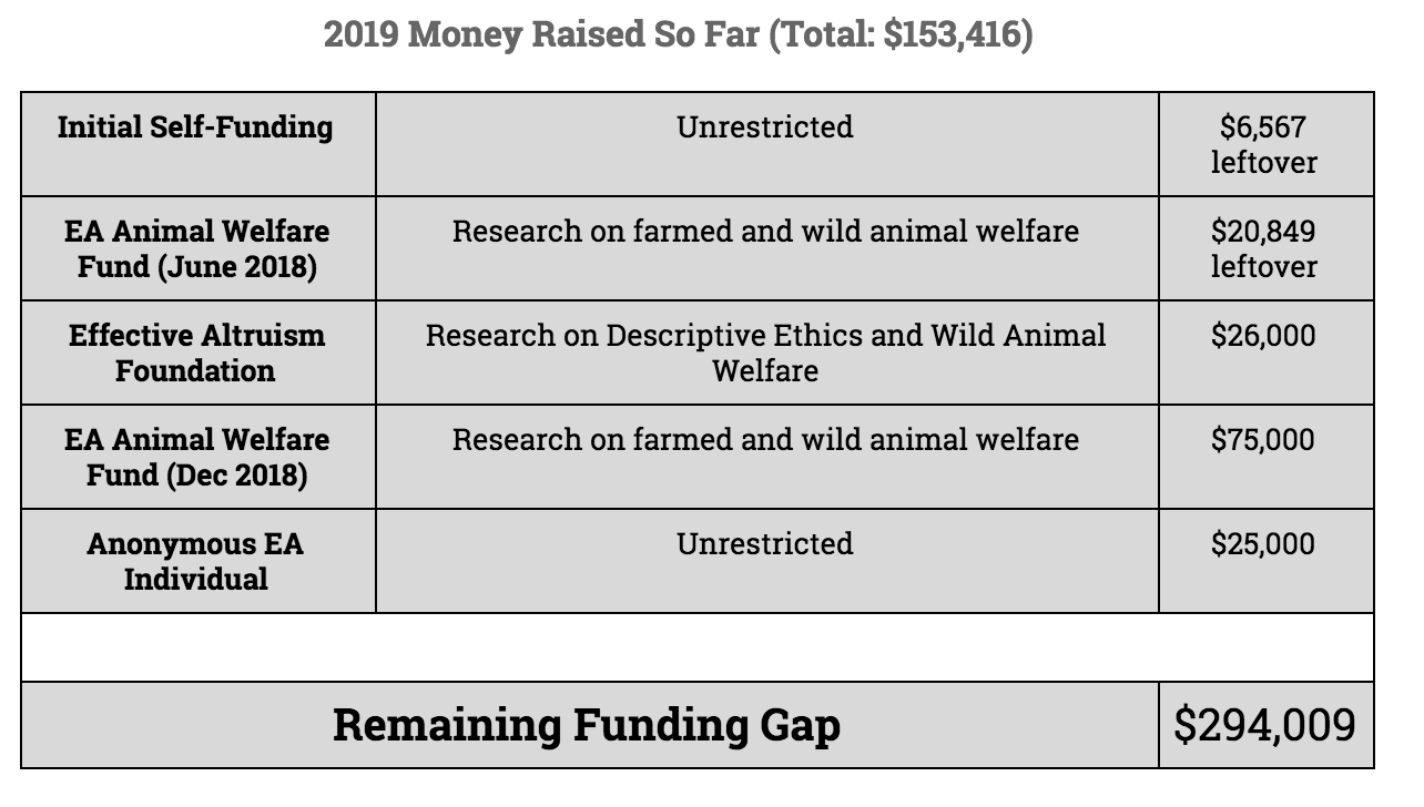 But thanks to generous funders, so far we’ve already raised ~$153K, thus making our funding needs ~$294K for 2019: