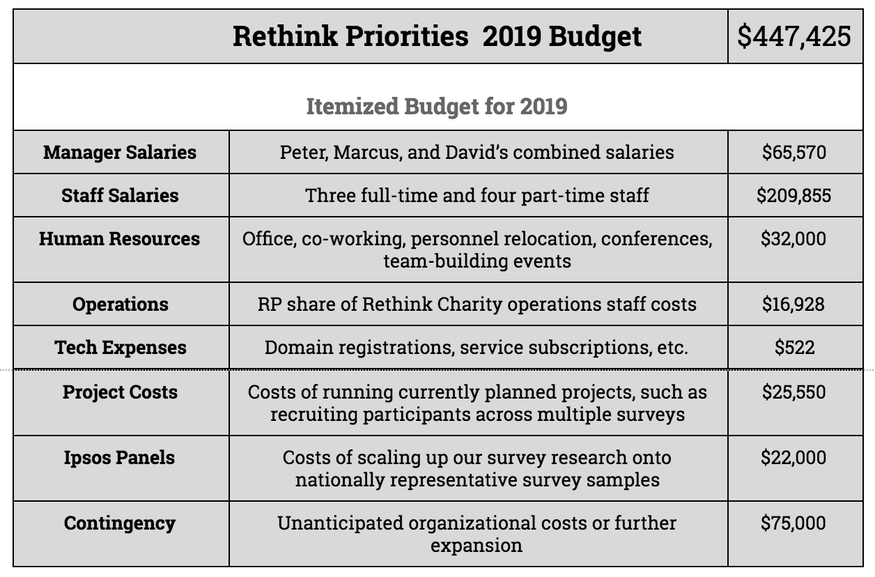 Rethink Priorities is an independent project of Rethink Charity, founded in January 2018 by Peter Hurford and Marcus A. Davis to figure out how to better allocate our time and money toward doing more good. We recently expanded to a team of ten and have an exciting research agenda for 2019. Our 2019 budget is $447K (see table below for details) and we are looking to raise $294K more. If you’re interested in funding Rethink Priorities, or for more information, email Marcus A. Davis (marcus@rtcharity.org).