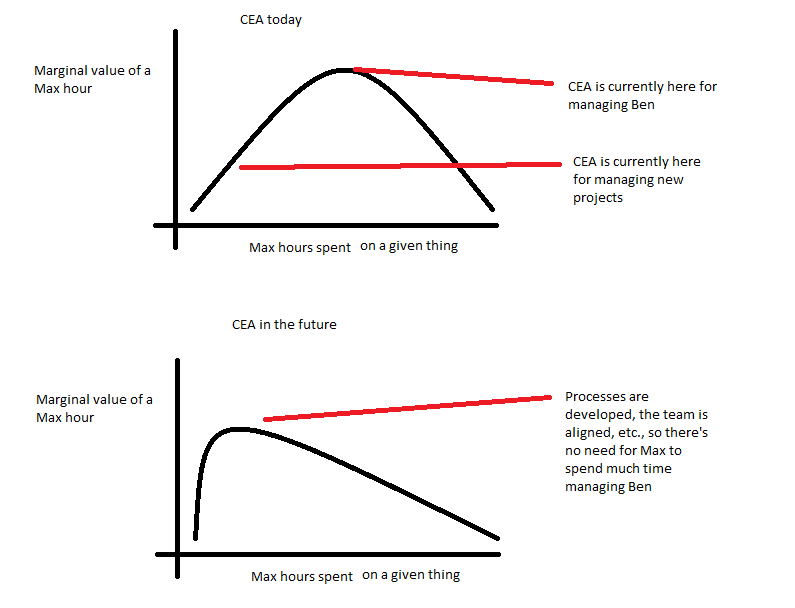 My view is that the marginal value of a Max hour is inverse U-shaped for both of these, and the maxima are fairly far out. (E.g. Max meeting with his directs once every two weeks would be substantially worse than meeting once a week.) As CEA develops, the maximum marginal value of his management hour will shift left while the curve for new projects remains constant, and at some point it will be more valuable for him to think about a new thing than speak with me about an old thing.