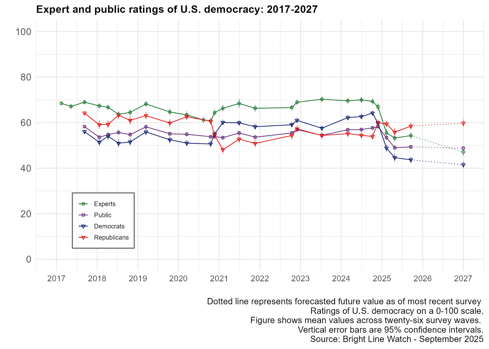 While prediction markets drifted, expert assessments of American democracy underwent a dramatic decline. Bright Line Watch, which surveys political scientists at American colleges and universities, recorded a drop from 67⁄100 in November 2024 to 53⁄100 by April 2025; a 14-point collapse in five months. When asked to forecast their rating for 2027, experts projected a continued decline to 48.