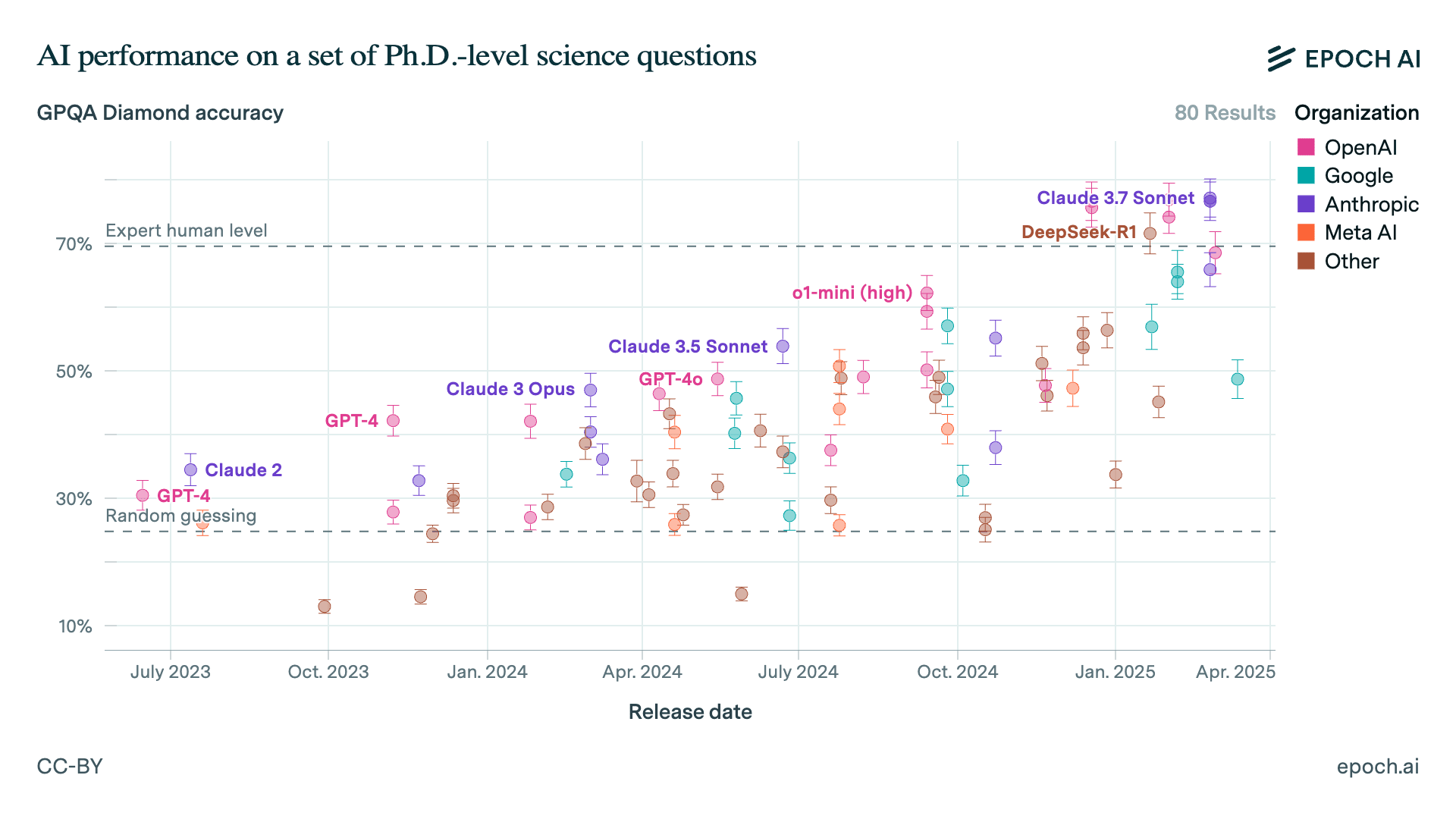 In just a year, this let them surpass human PhDs at answering difficult scientific reasoning questions, and achieve expert-level performance on one-hour coding tasks.